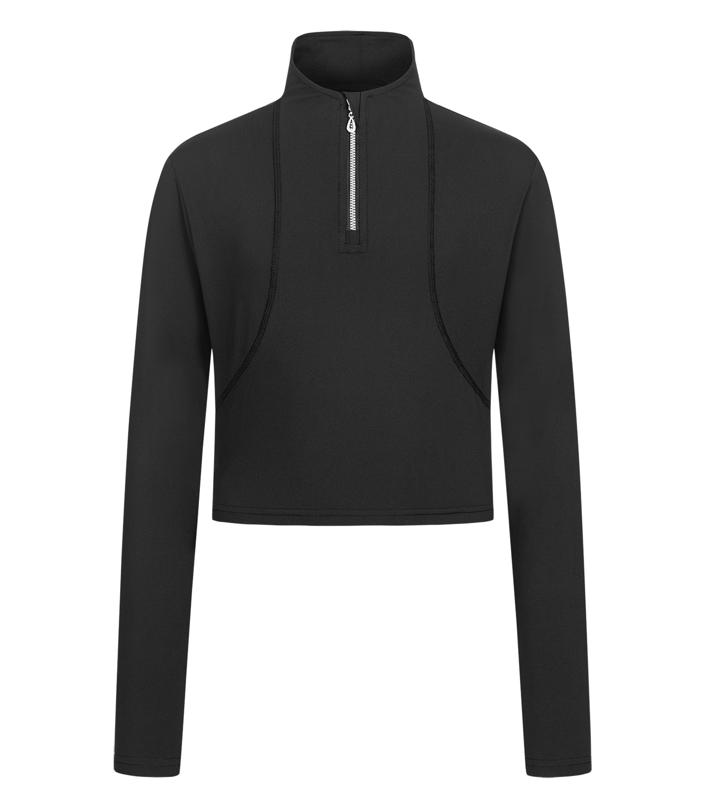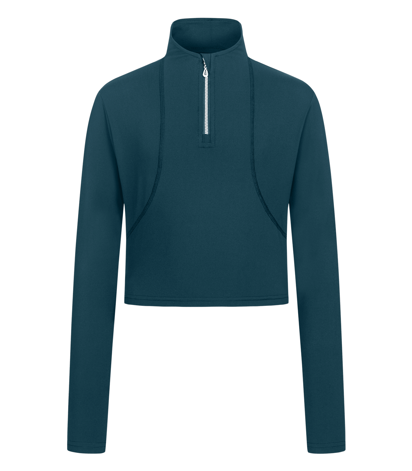 De Alina top is vervaardigd uit ademend technisch materiaal dat comfort en bewegingsvrijheid biedt. Verkrijgbaar in zwart en petrol blauw, met een opstaande kraag voorzien van rits en kinbescherming. Logo op rechtermouw en bovenrug.