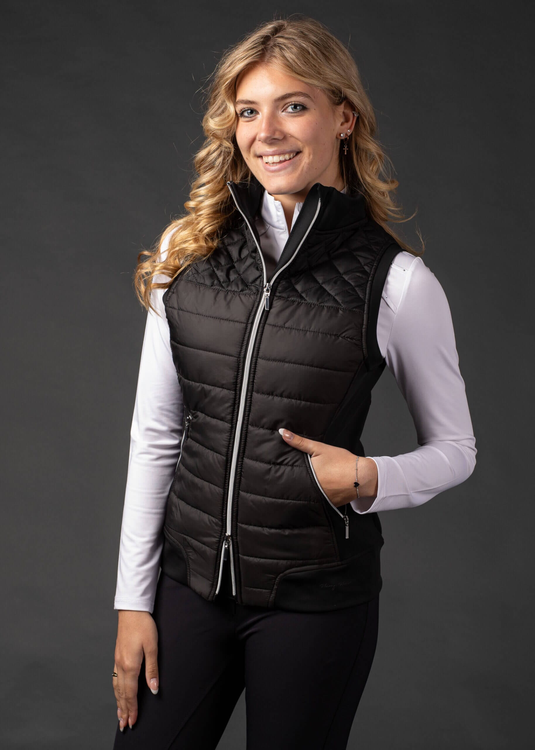 Sportieve bodywarmer met gevoerde body en comfortabele stretch zijpanelen, een tweeweg ritssluiting en twee steekzakken met ritssluiting. 100% polyester.