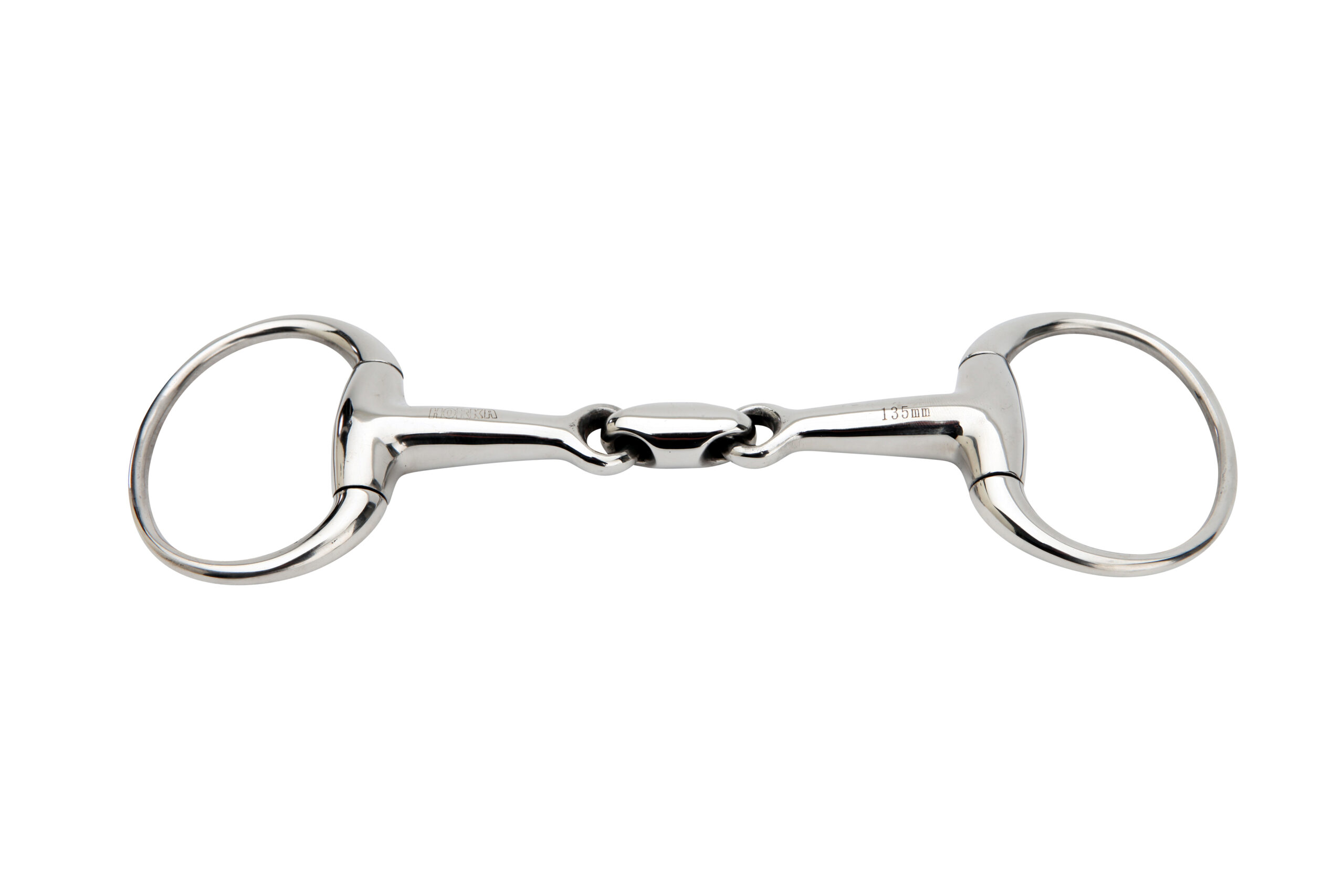 Dubbel gebroken bustrens 18 mm. Ook verkrijgbaar in kleine maten geschikt voor shetland ponys. Productspecificaties: Massief Dikte: 18 mm Ring: 70 mm Roestvrij staal