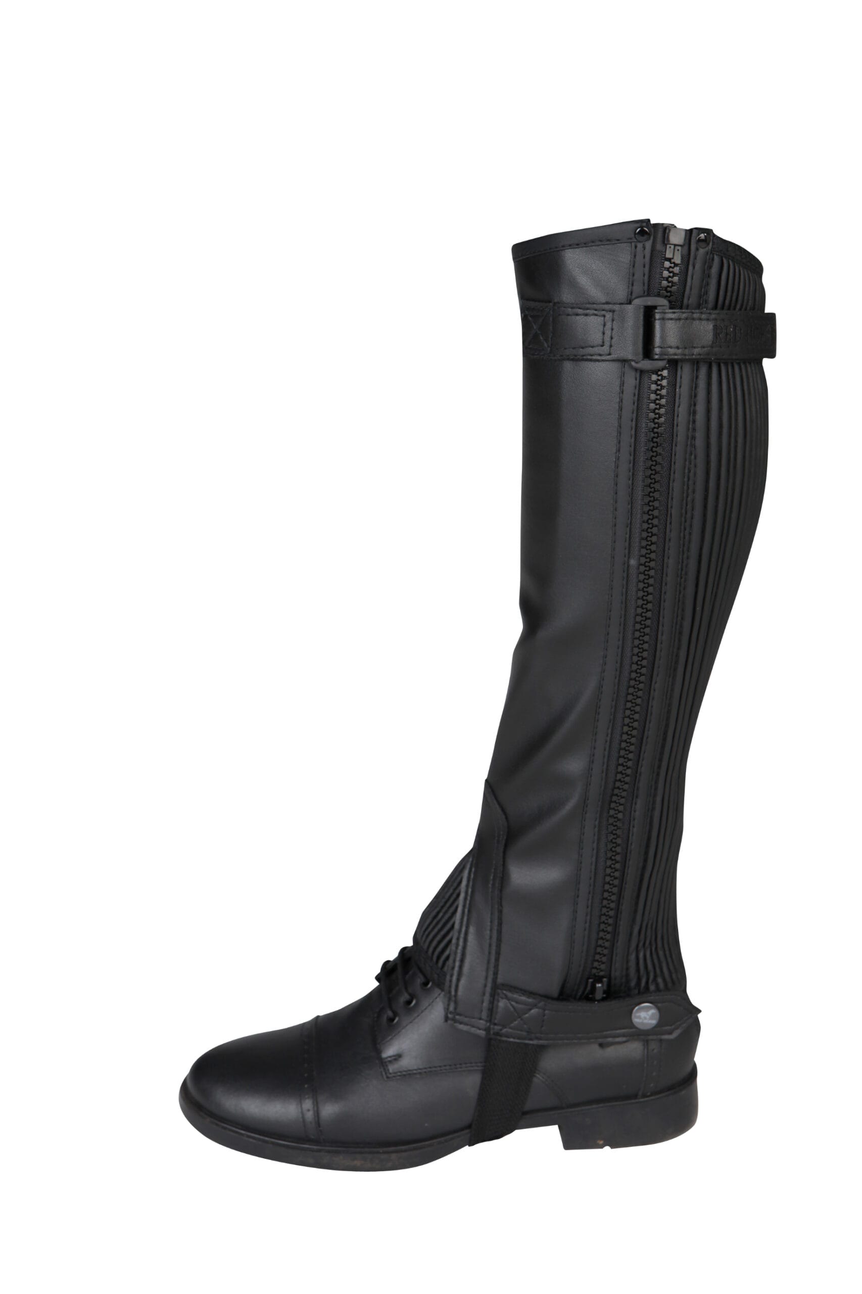 Mini chaps van kunstleer. Ook verkrijgbaar in bredere kuitmaten zie artikel 590667.