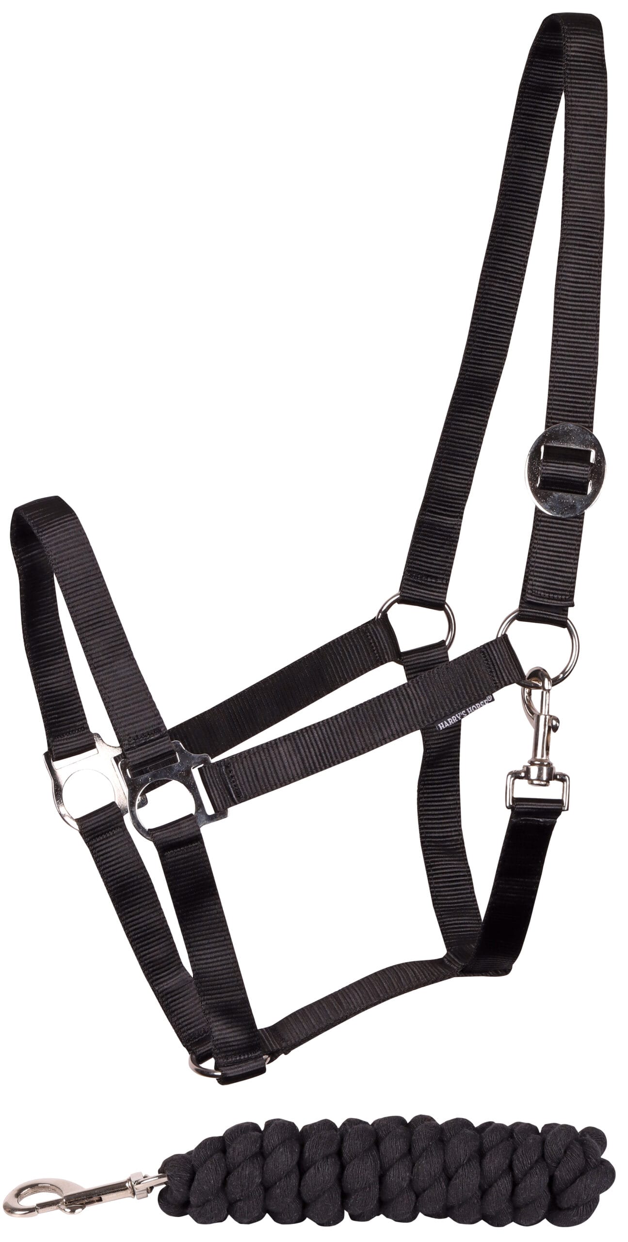 Basis halsterset met zilverkleurige fournituren. Het halster is verstelbaar op kopstuk door middel van een schuifgesp. Lengte halstertouw is 180cm. Materiaal: Halster: polypropyleen Halstertouw: katoen