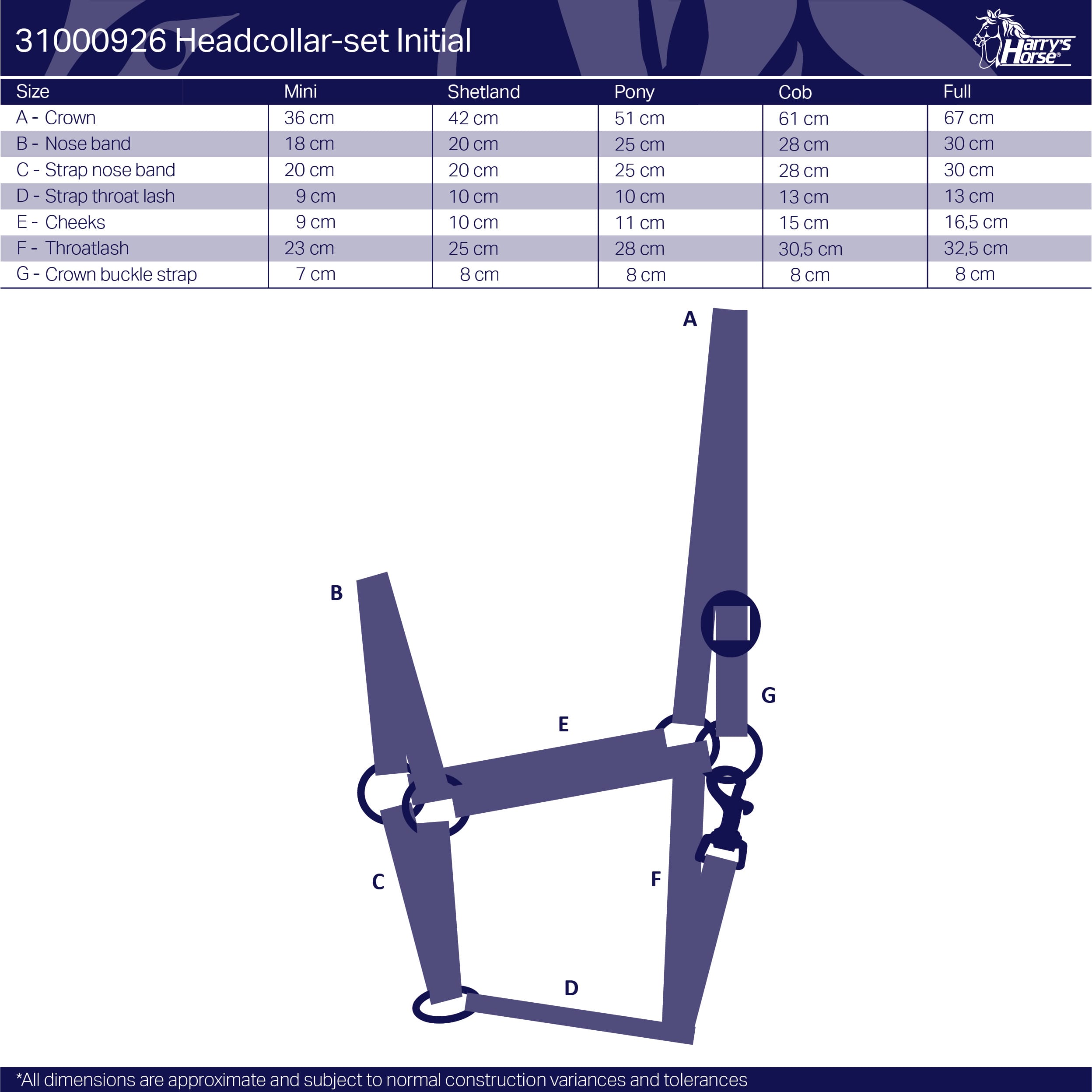 Basis halsterset met zilverkleurige fournituren. Het halster is verstelbaar op kopstuk door middel van een schuifgesp. Lengte halstertouw is 180cm.