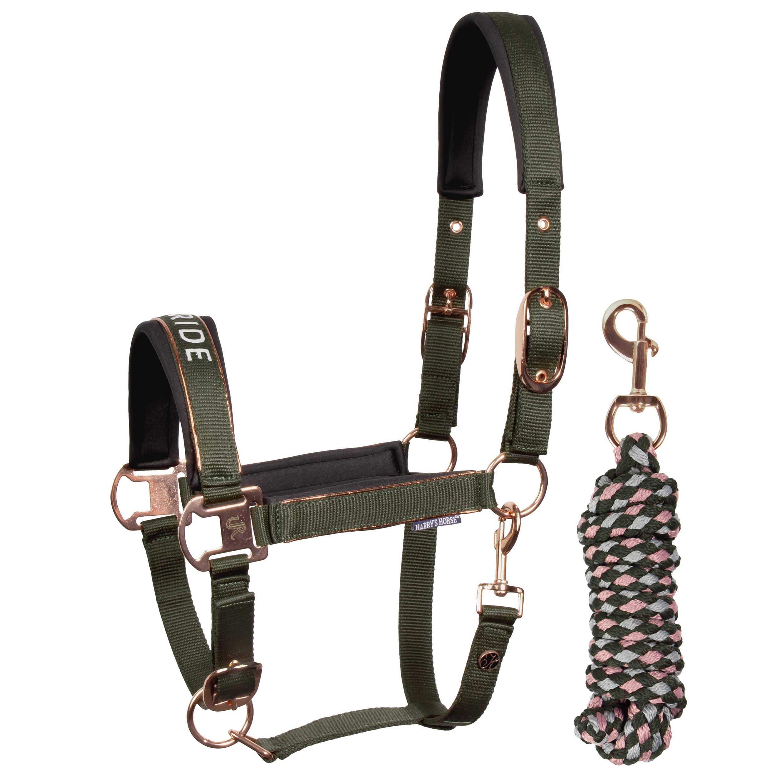 Halsterset met neopreen voering, rosegold fournituren met JR laserprint, rosegold piping, Just Ride print op de neusband, inclusief 2m touw. Materiaal: 100% polyester.