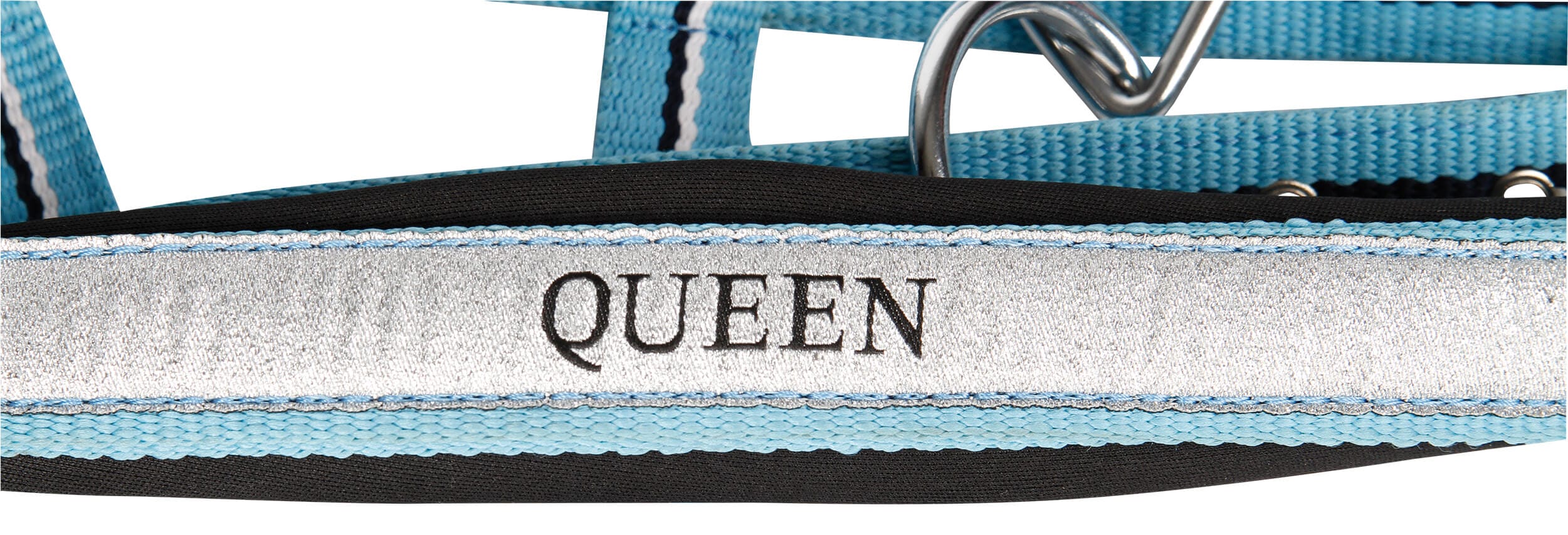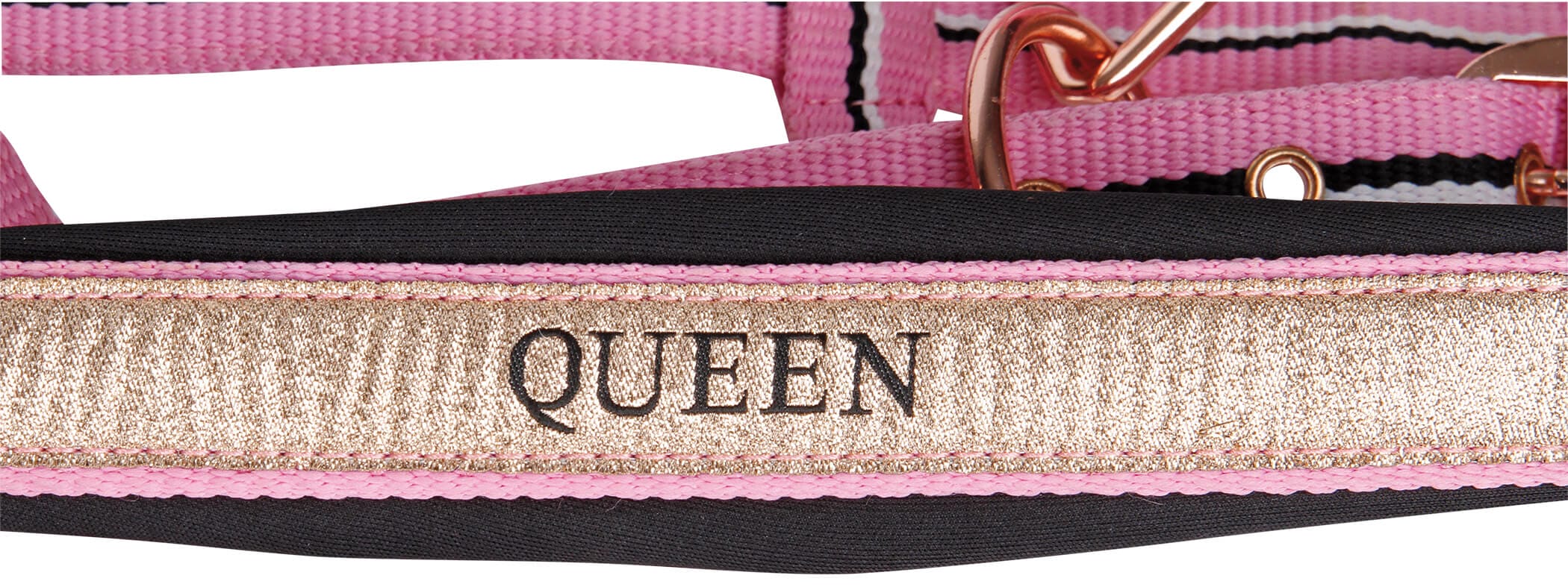 Halster bijpassend bij het halster Foal, dubbel verstelbaar op het kopstuk en op de kin, neopreen onderlegd, zilver- of rosegoudkleurige band op de neus met “QUEEN”, inclusief halstertouw.
