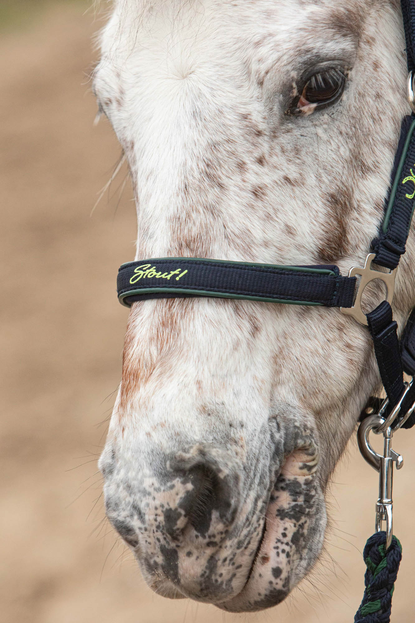 Halsterset met contrast piping en STOUT! Print op de neus en bakstukken en een zachte neopreen voering. Het kopstuk is aan beide kanten verstelbaar en is ook verstelbaar op de neus. Inclusief een 2 halstertouw van 2 meter.