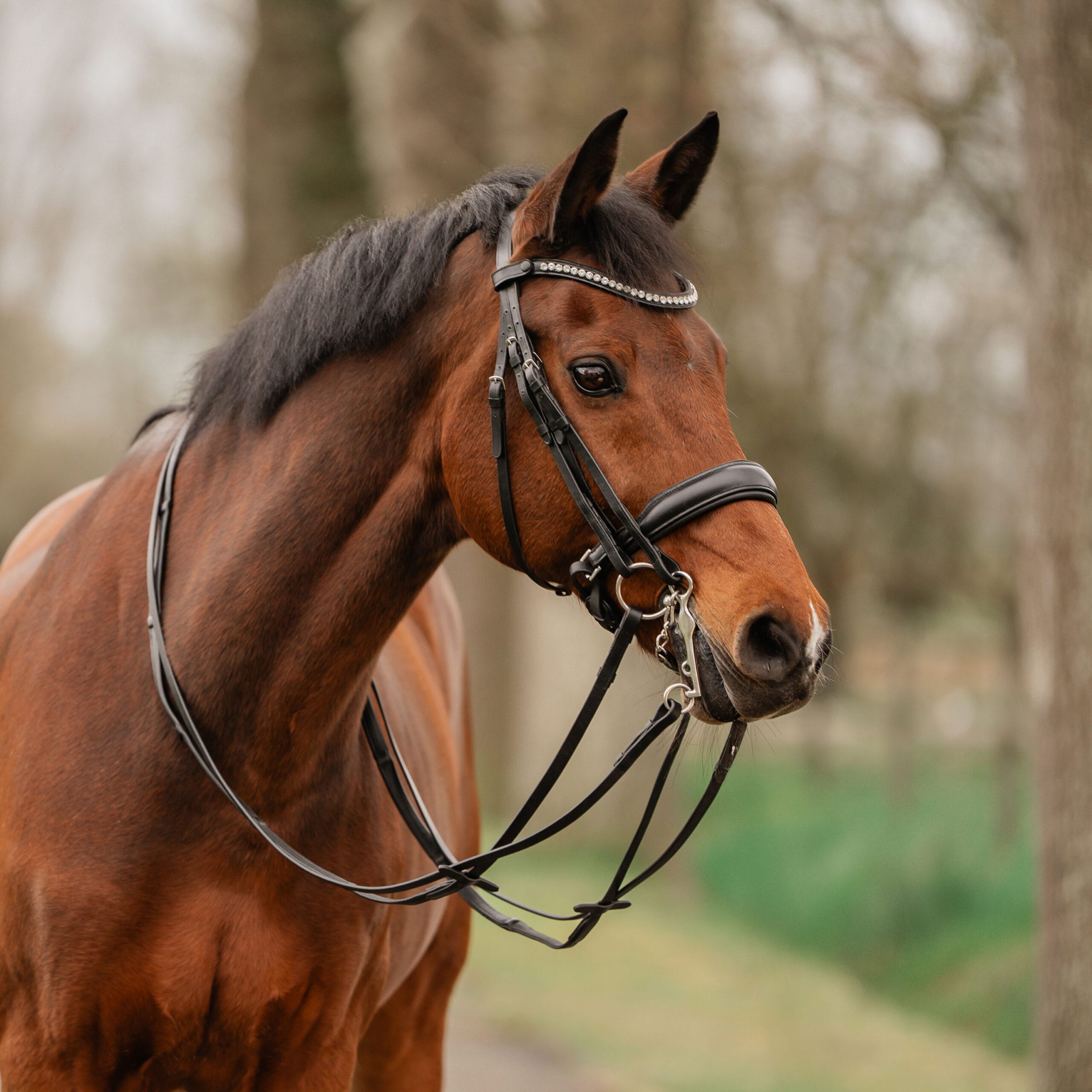 Chique stang en trens hoofdstel met anatomisch gevormd kopstuk. De frontriem met kristallen is gemakkelijk afneembaar door middel van een praktische drukknoop. Productspecificaties: < Anatomisch gevormd kopstuk Frontriem met kristallen stenen Gemakkelijk afneembare frontriem door middel van een drukknoop Kopstuk en neusriem gevoerd met zacht leer Exclusief teugels: voor bijpassende teugels zie 180086 en 180127 Materiaal:< 100% leer