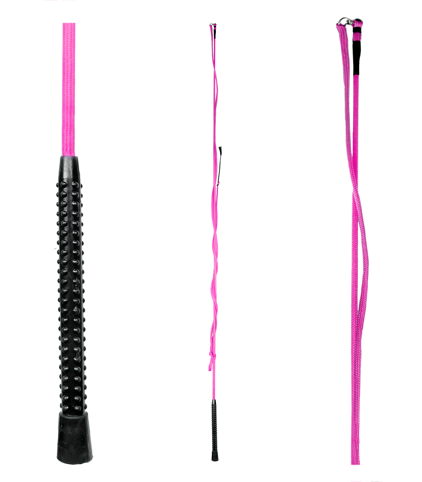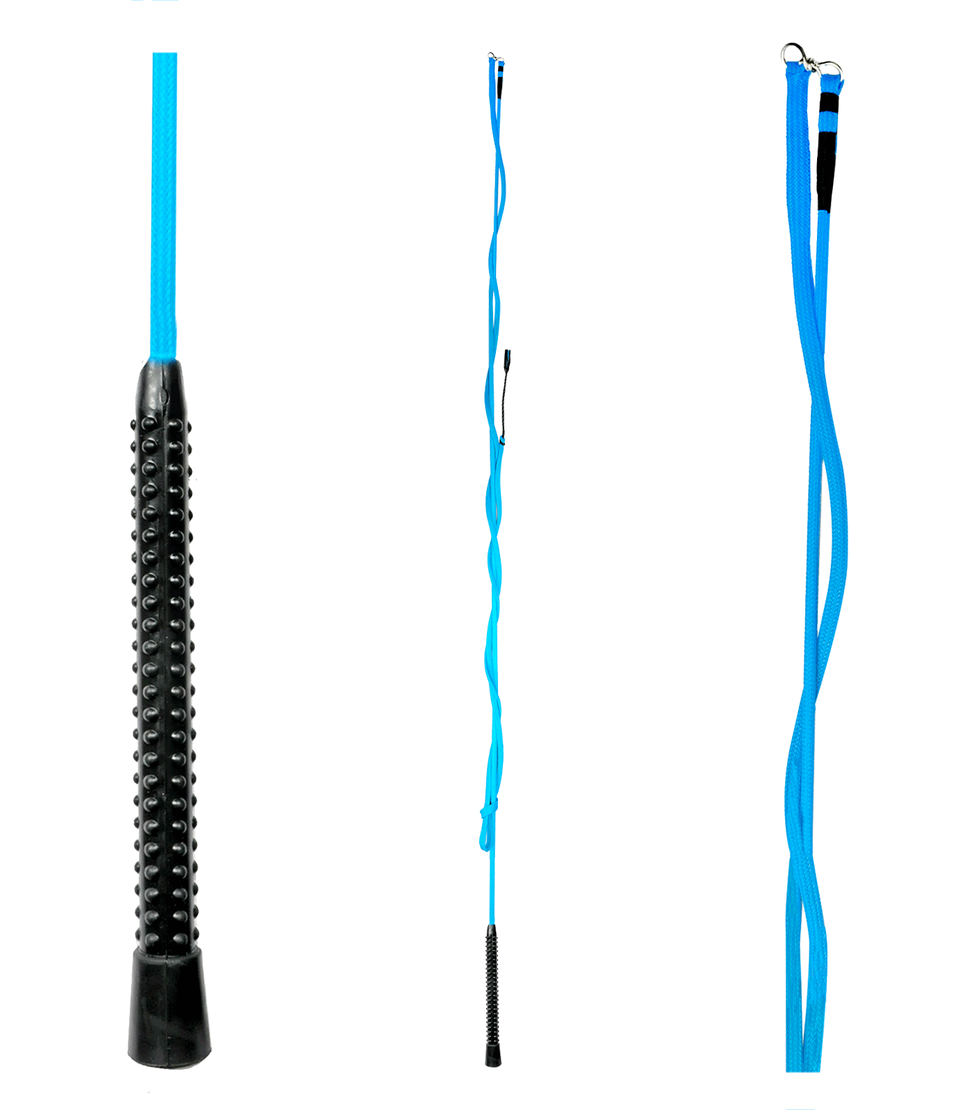Deze longeerzweep is bedekt met duurzaam nylon en voorzien van een stevige kunststof handvat. Beschikbaar in lengtes van 180 cm en 200 cm, en in de kleuren azuurblauw, zwart en roze.