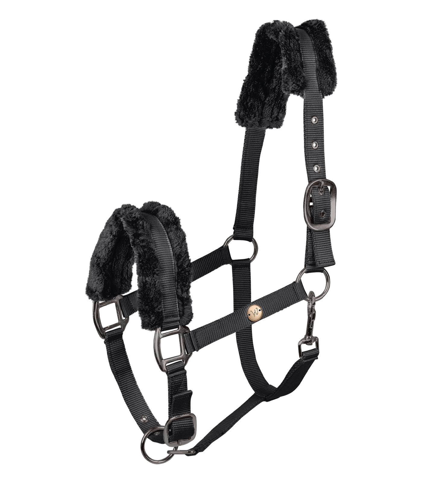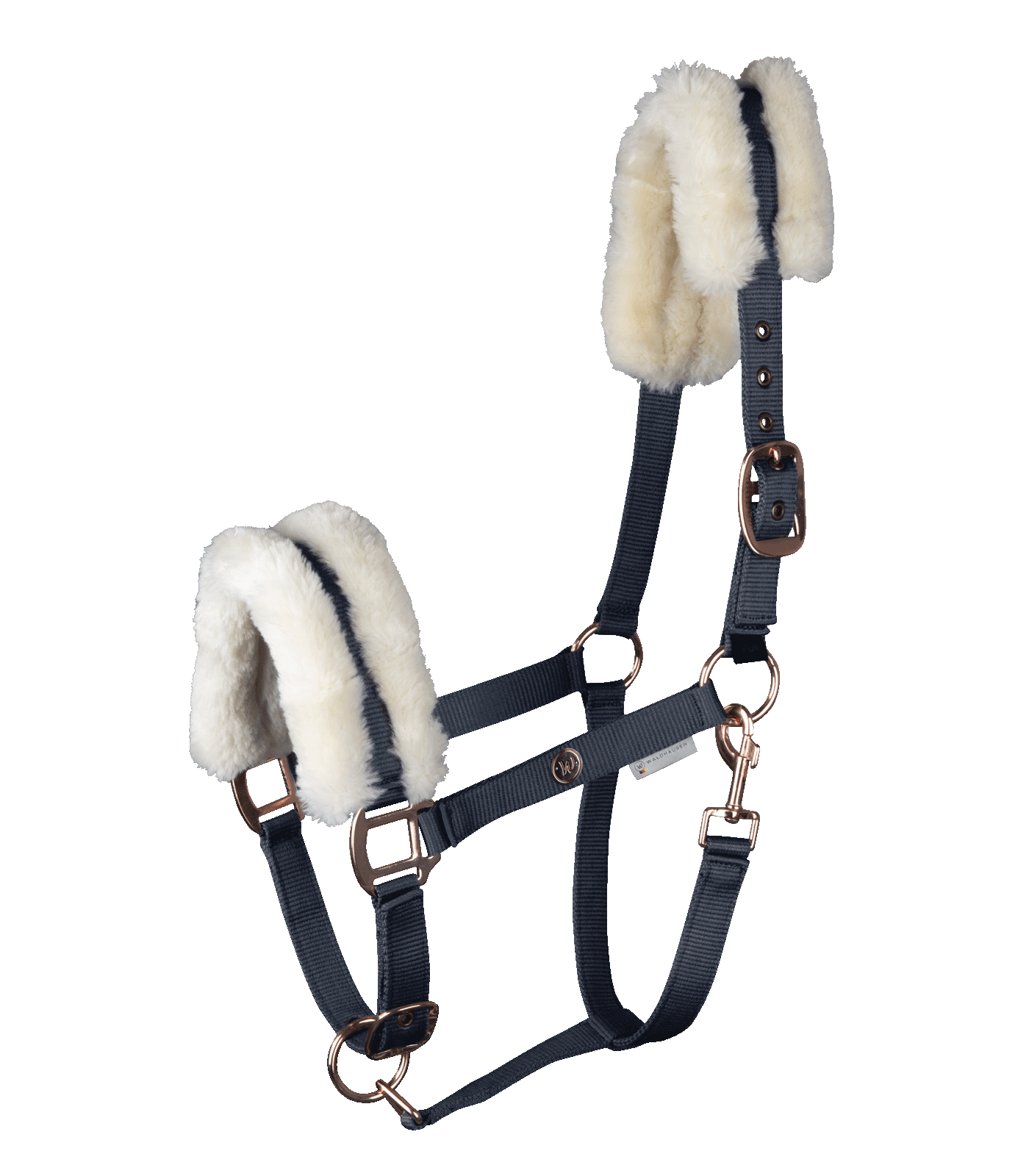 Dit moderne rosé halster is beschikbaar in de maten Full en Cob. Het is vervaardigd uit duurzame materialen met hoogwaardige beslag. De kopstukken en neusriem zijn voorzien van zacht synthetisch bont. Beschikbare kleuren zijn zwart/antraciet en nachtblauw/roségoud.