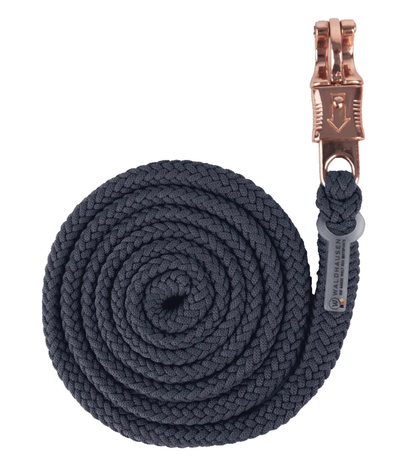 Het halstertouw, uitgevoerd in zwart/antraciet of nachtblauw met roségouden accenten, is volledig gevlochten voor duurzaamheid. De paniekhaak en fittingen in roségoud zorgen voor een veilige en stijlvolle bevestiging aan het halster.