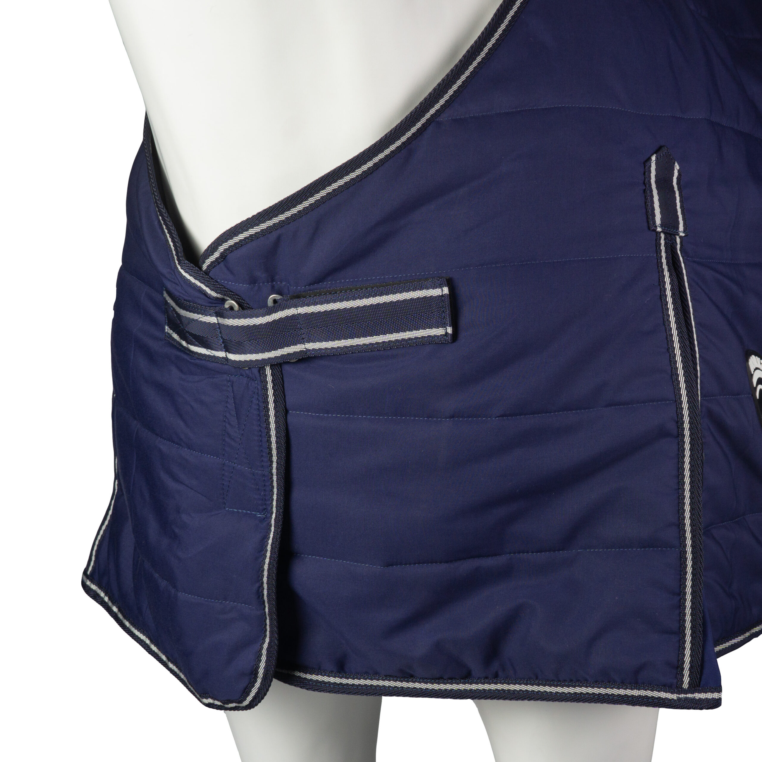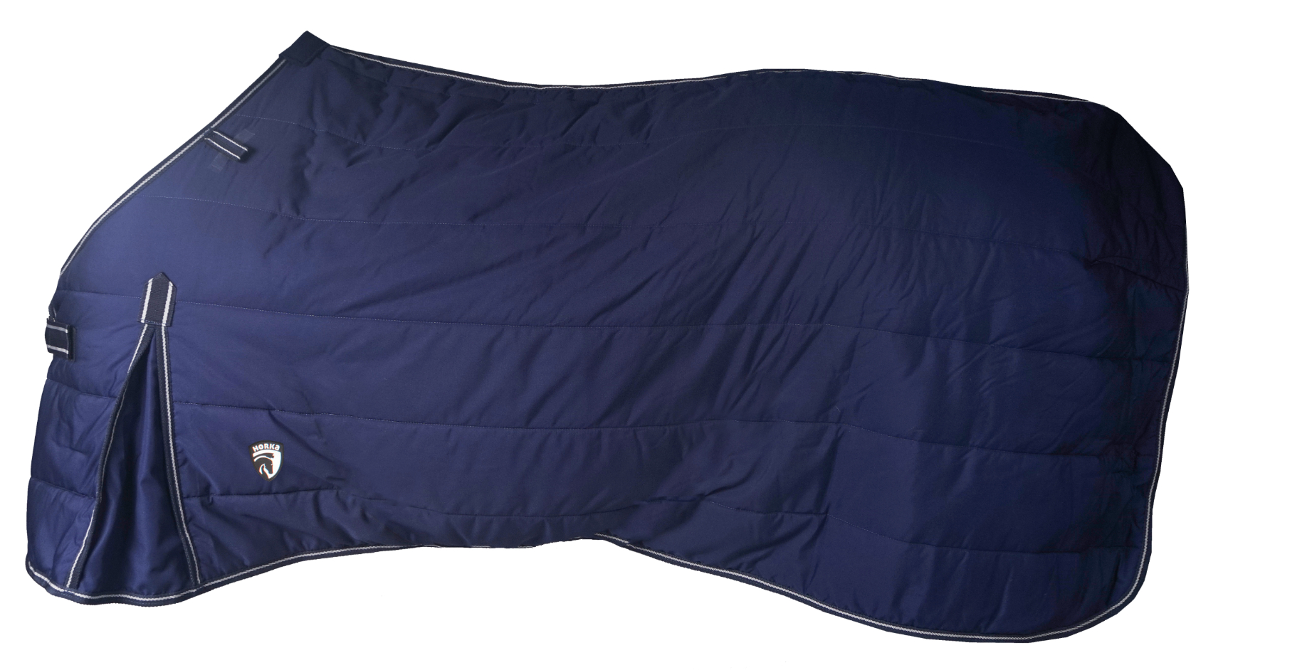 Onderdeken van soft polyester (blauw) Productspecificaties: Voering van polyester 200 gram vulling Surcingle voorsluiting met klittenbandsluiting D ringbevestigingen voor beenbanden Met fleece gevoerde schoft Klittenbandlus op de schoft om het onderdeken aan een buitendeken te bevestigen.
