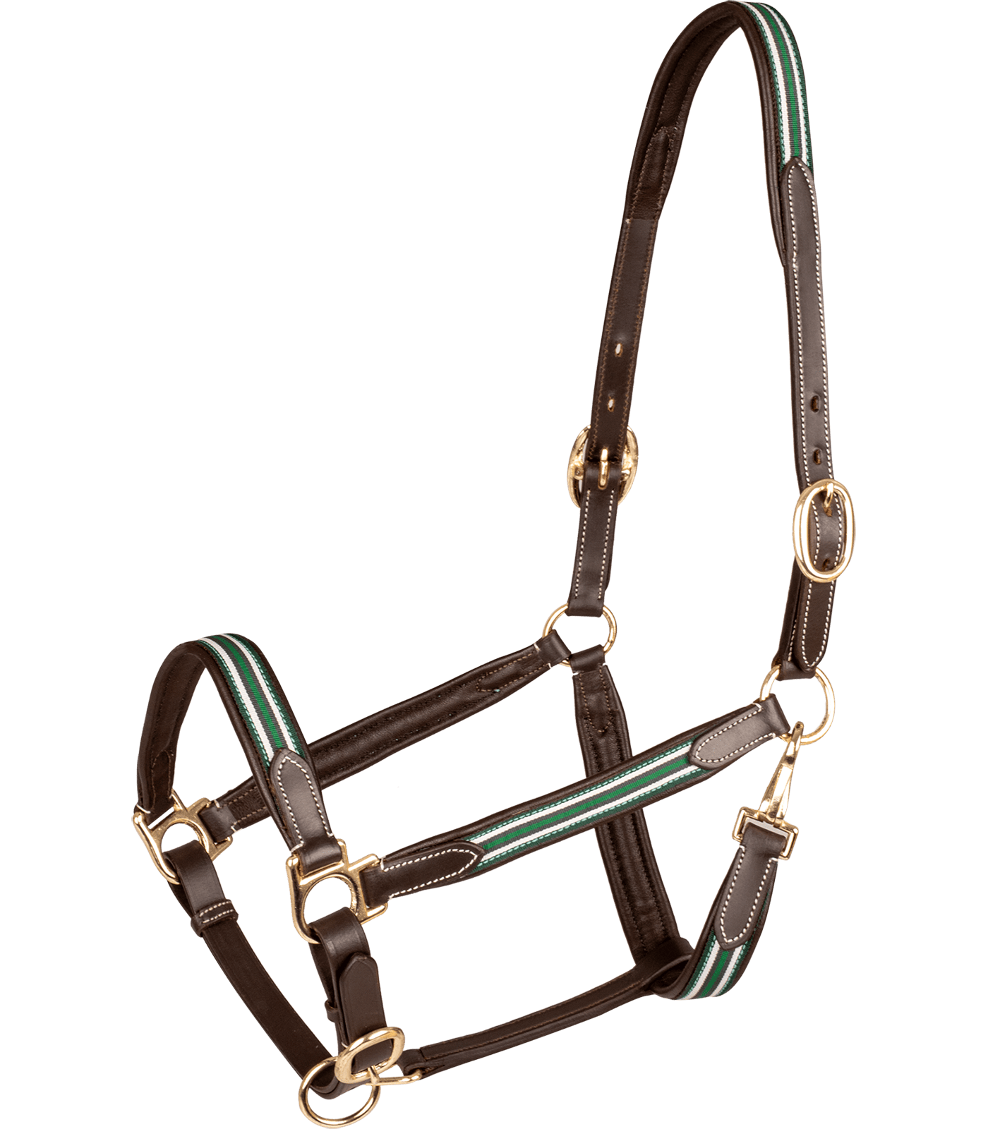 Het Oxford leren halster kenmerkt zich door zacht leer met sierstiksels. Nylon riemen verfraaien de neusriem en bakstukken. Met goudkleurige gespen, verstelbaar aan beide zijden van de hals. Beschikbaar in beige en groen.