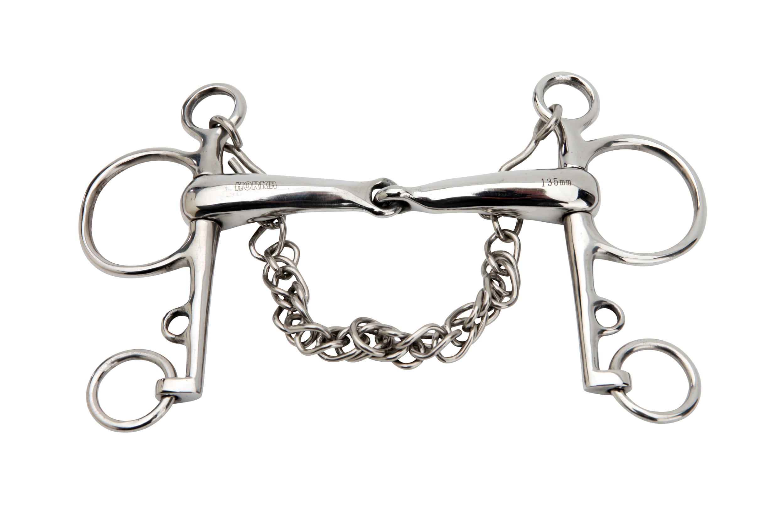 Gebroken pelham 19 mm met losse scharen. Productspecificaties: Hol Dikte: 19 mm Scharen 140 mm Roestvrij staal