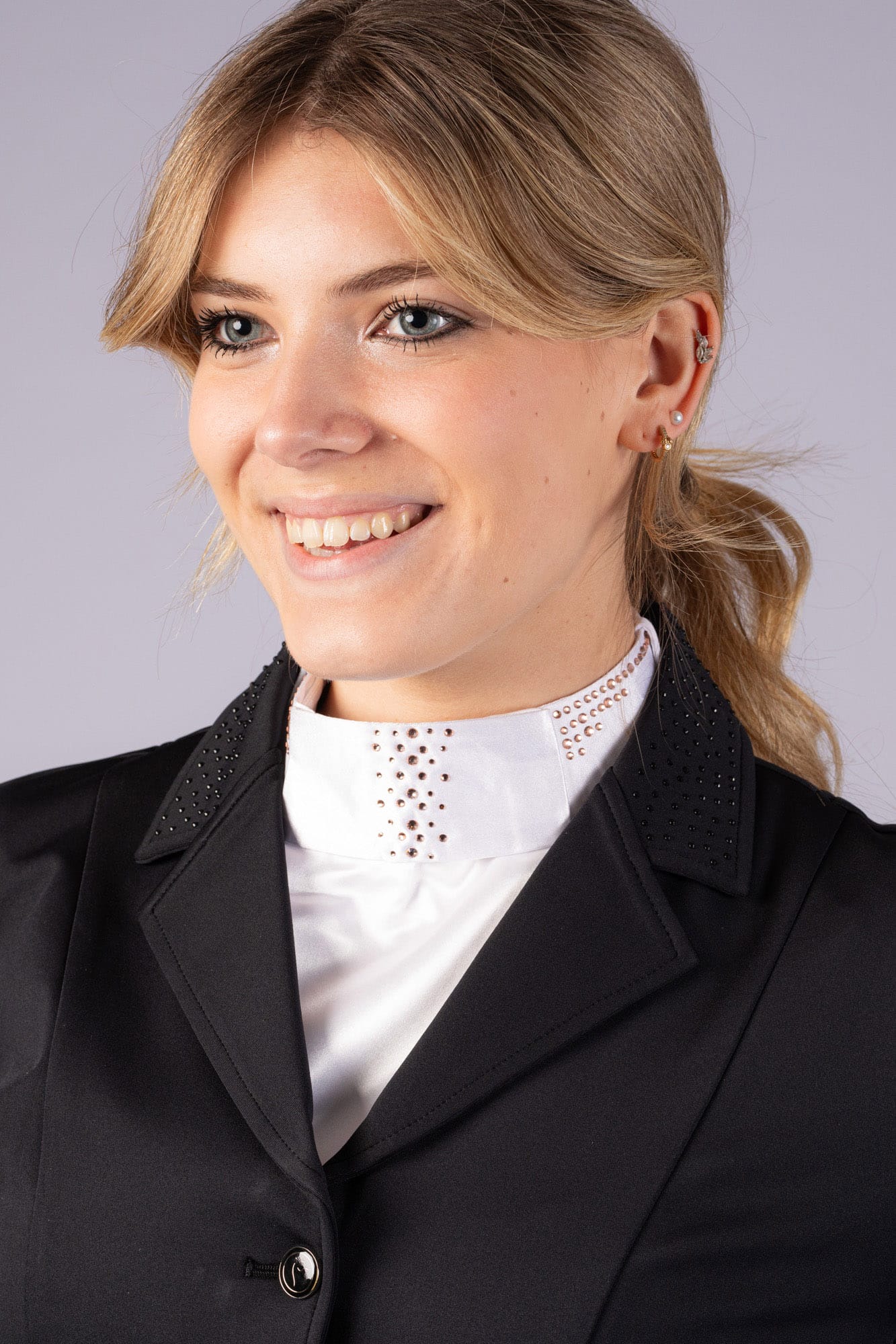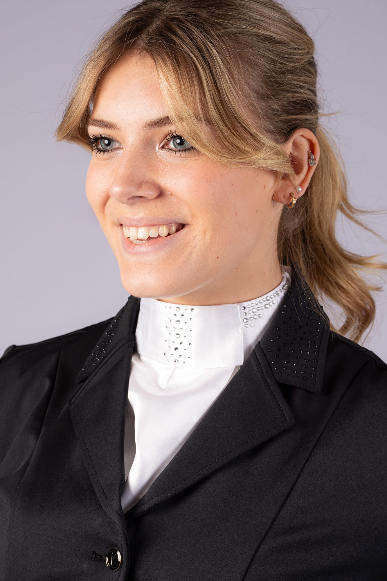Plastron met klittenbandsluiting aan de achterzijde. De plastron is versierd met zilver- en rosegoudkleurige kristallen.