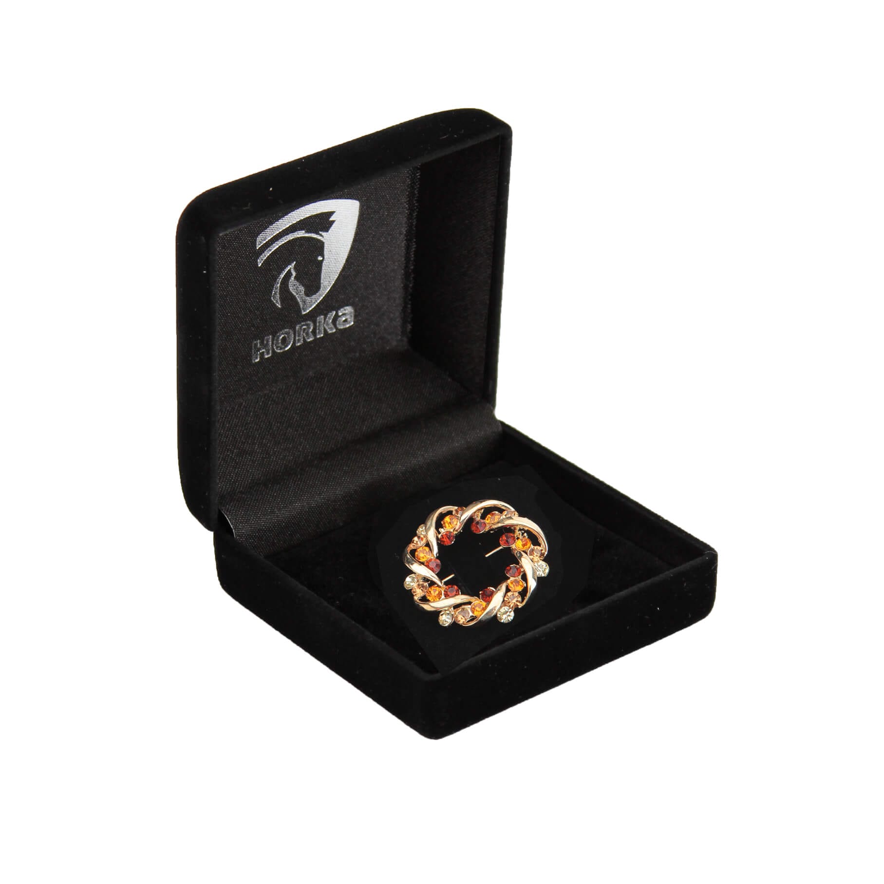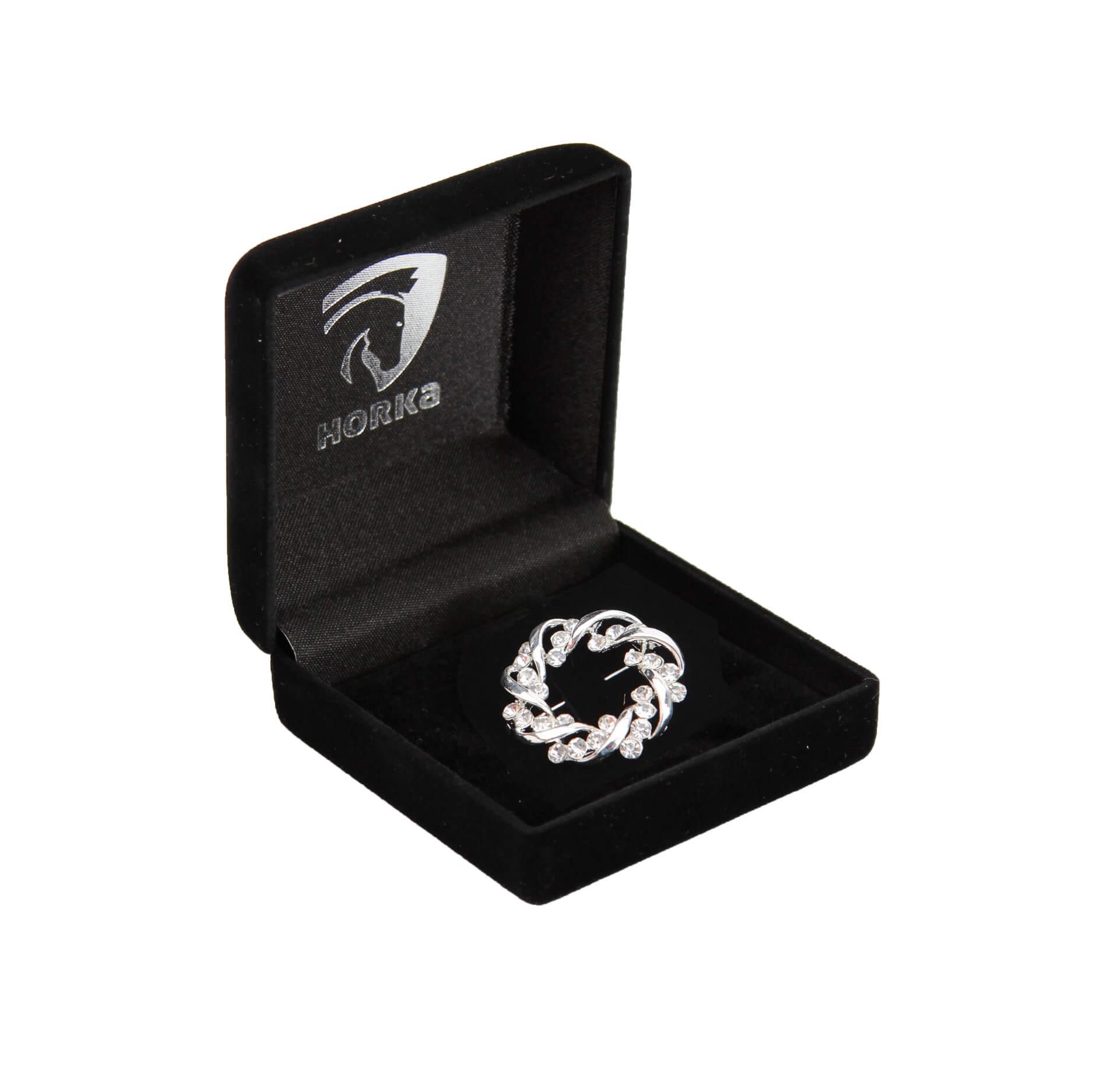 Plastronspeld in vorm van een krans afgewerkt met strass steentjes. Verpakt in luxe doosje