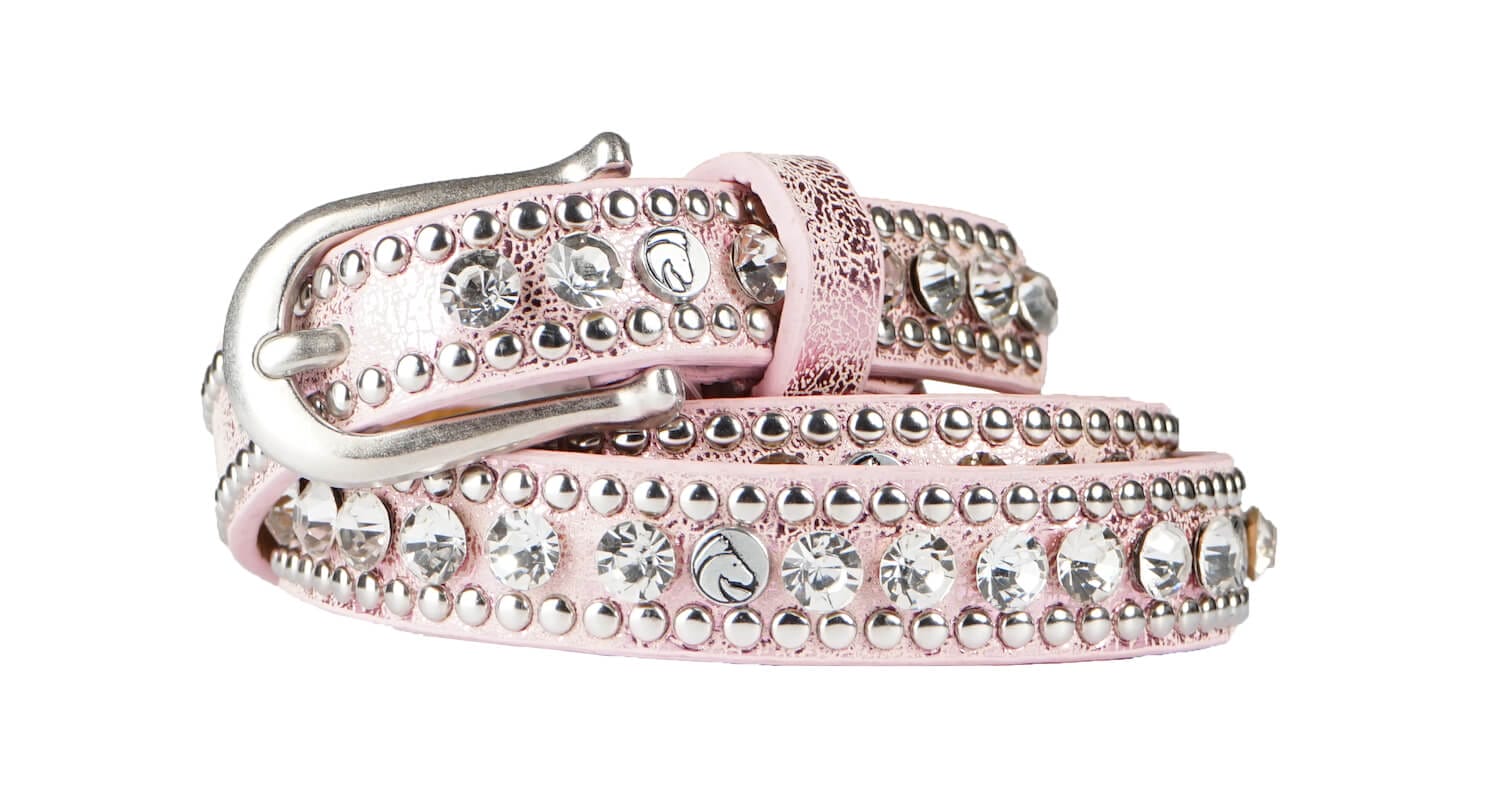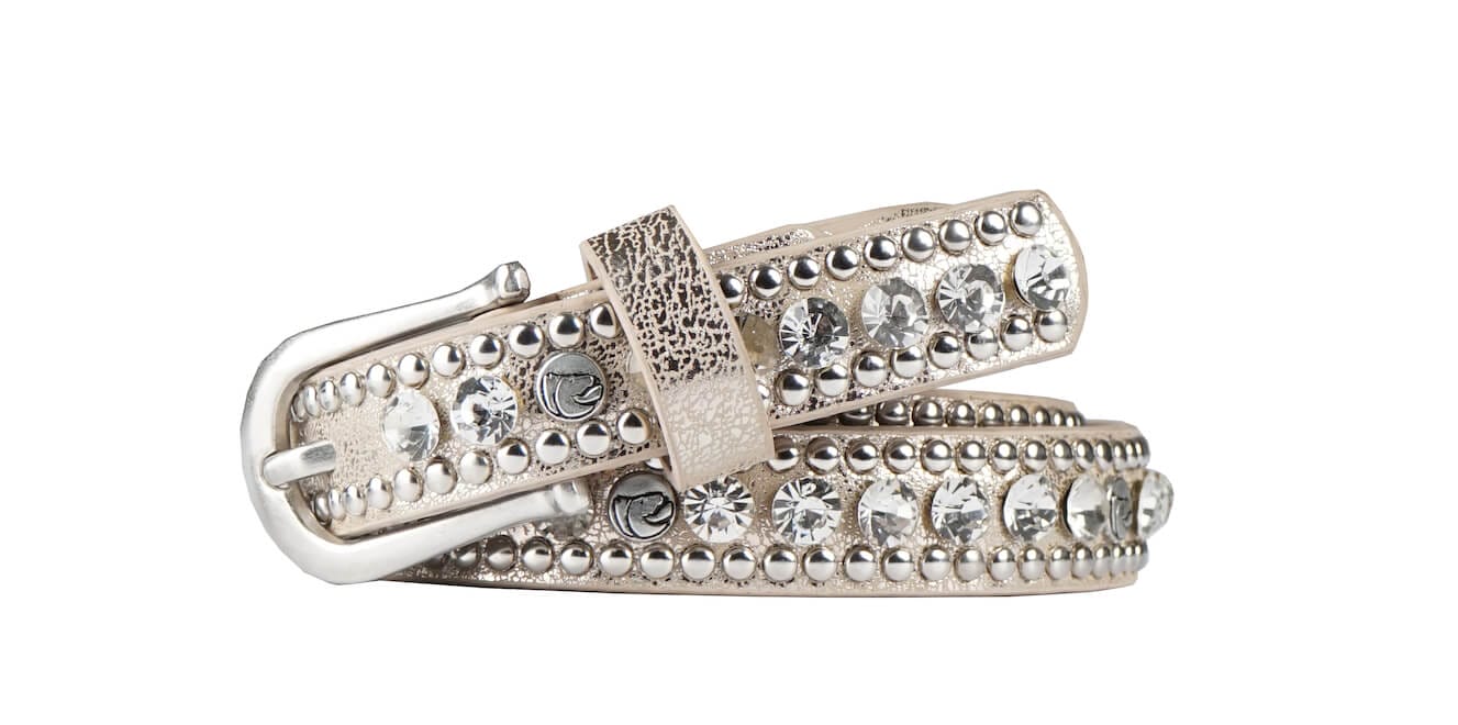 Elegante dames riem afgewerkt met (glitter)studs in de kleuren zilver en metaal. Afgewisseld met HORKA paarden op enkele studs. Let op: Verkrijgbaar in verscheidene maten. Maten zijn gemeten t/m het middelste gaatje (exclusief de gesp). Bij 85 cm is het 1e gaatje op 80 cm het middelste gaatje op 85 cm en het laatste gaatje op 90 cm. Breedte: 18 cm gesp lengte: 3 cm. Materiaal: Onderzijde leer bovenzijde PU