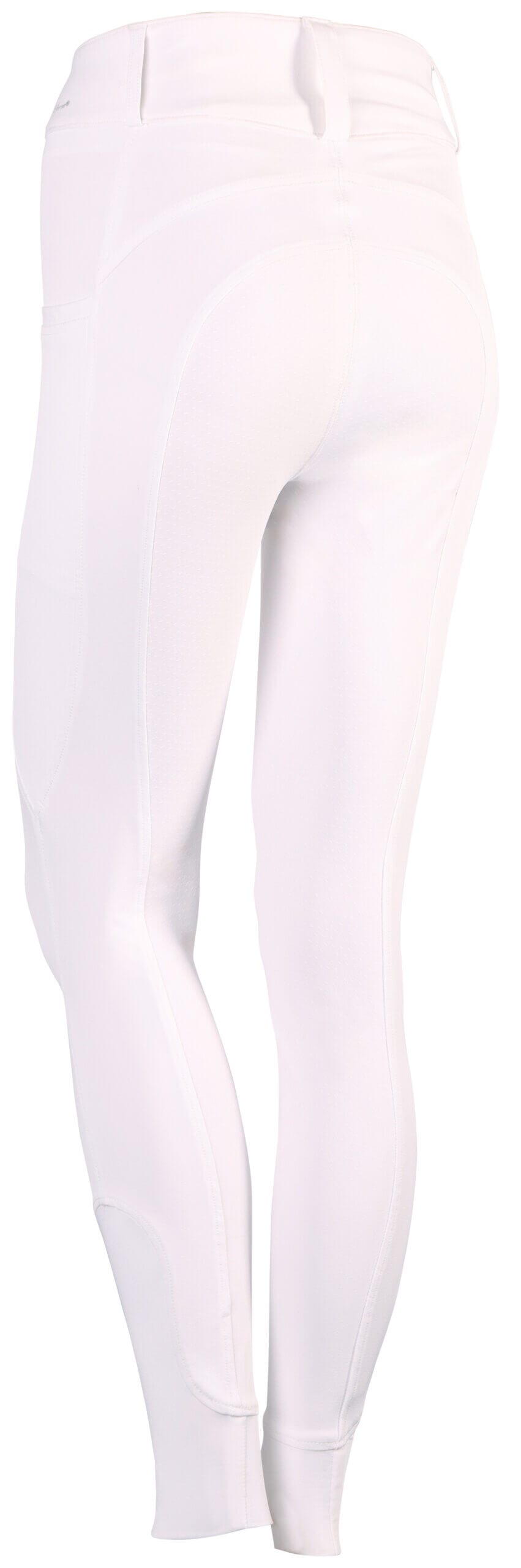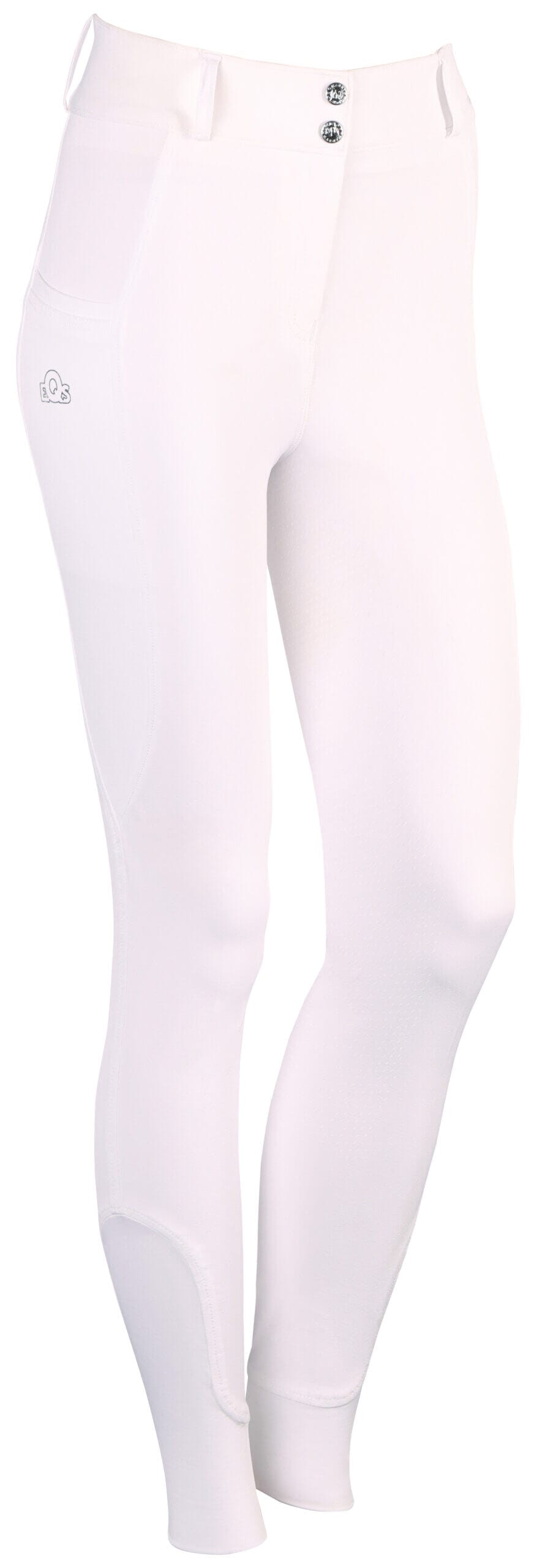 Rijbroek met hoge tailleband, twee zakken aan de zijkant met een zilverkleurige EQS print, rondgenaaid zitvlak voorzien van een siliconen print voor extra grip in het zadel en een elastische inzet rond de enkels voor meer comfort in je rijlaarzen.