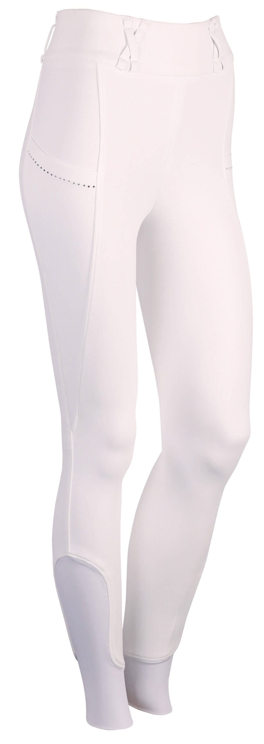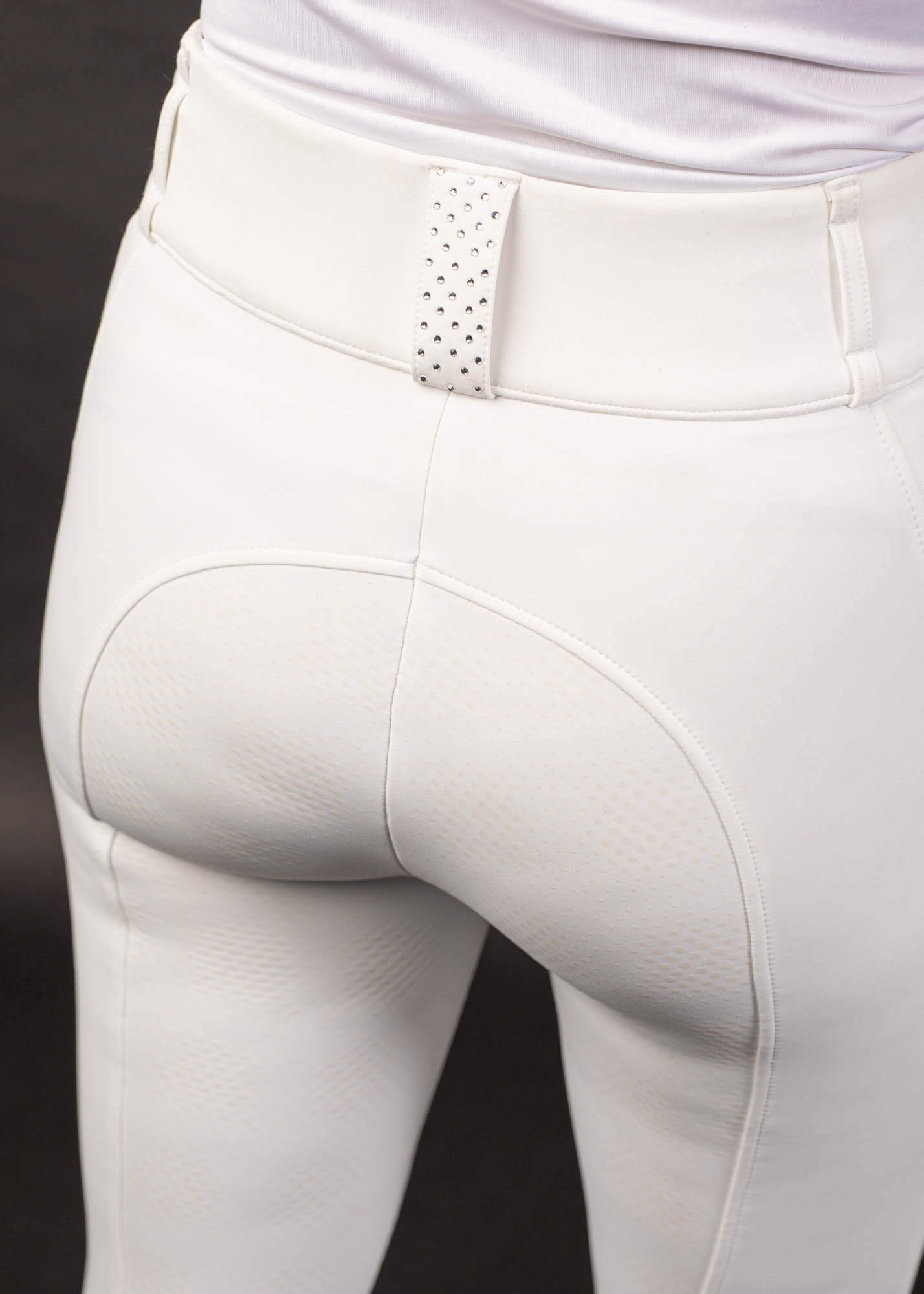 Paardrijlegging met een hoge tailleband met riemlussen waarvan een brede op de achterkant gedecoreerd met kristallen, twee steekzakken met kristallen, rondgenaaid zitvlak met een siliconen print voor extra grip in het zadel en een elastische inzet rond de enkels voor meer comfort.