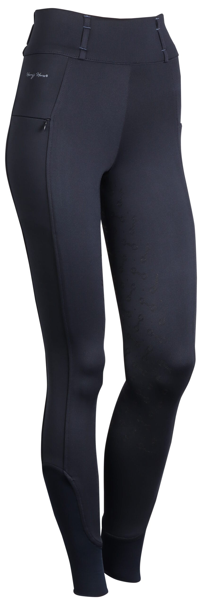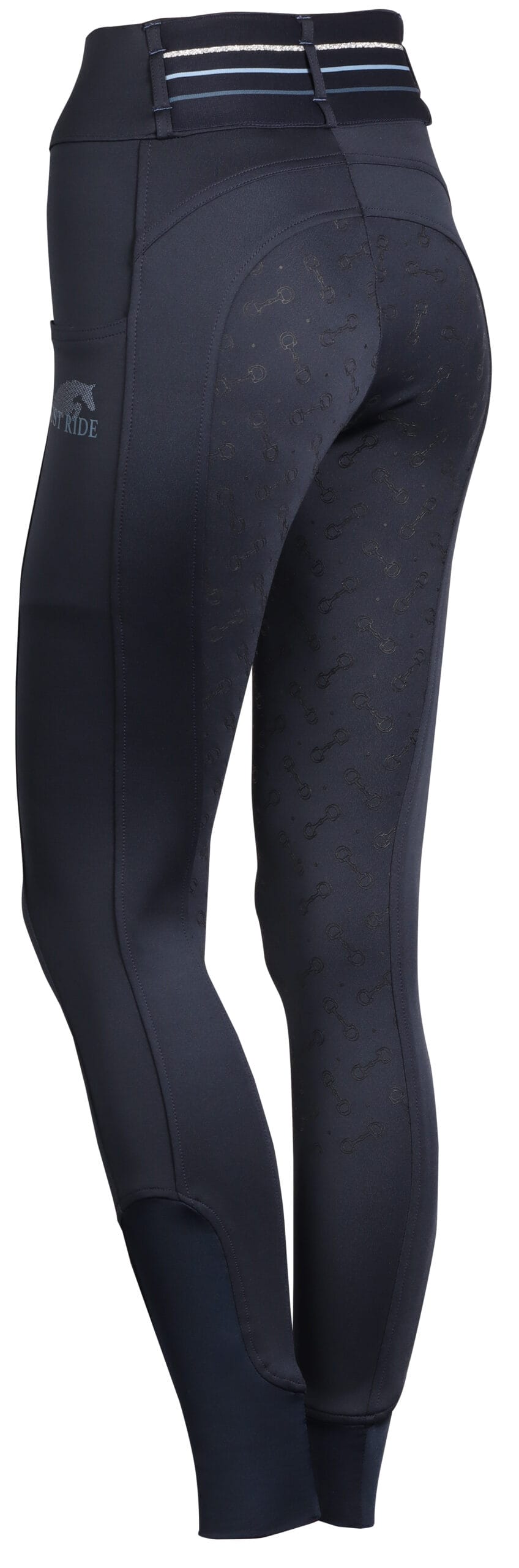 Paardrijlegging met twee steekzakken voorzien van een ritssluiting en aan de linkerkant een Just Ride print. De broek heeft een brede tailleband met riemlussen en streepdetails op de achterkant, rondgenaaid zitvlak voorzien van een siliconen print voor extra grip in het zadel en een elastische inzet rond de enkels voor meer comfort in je paardrijlaarzen.