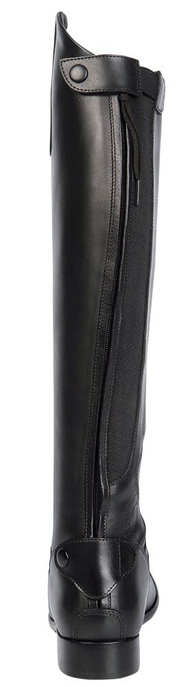 Gladlederen laars met dressuurboog, elastische veters en een lange rits aan de achterzijde. Geheel leder gevoerd voor een goede ventilatie. Aan de bovenkant van de rits zit een lederen beschermflap die eenvoudig te openen en sluiten is door middel van een drukknoop. Met een zachte versteviging op de enkel ter bevordering van het comfort. Voorzien van een chique, handgemaakte zool.