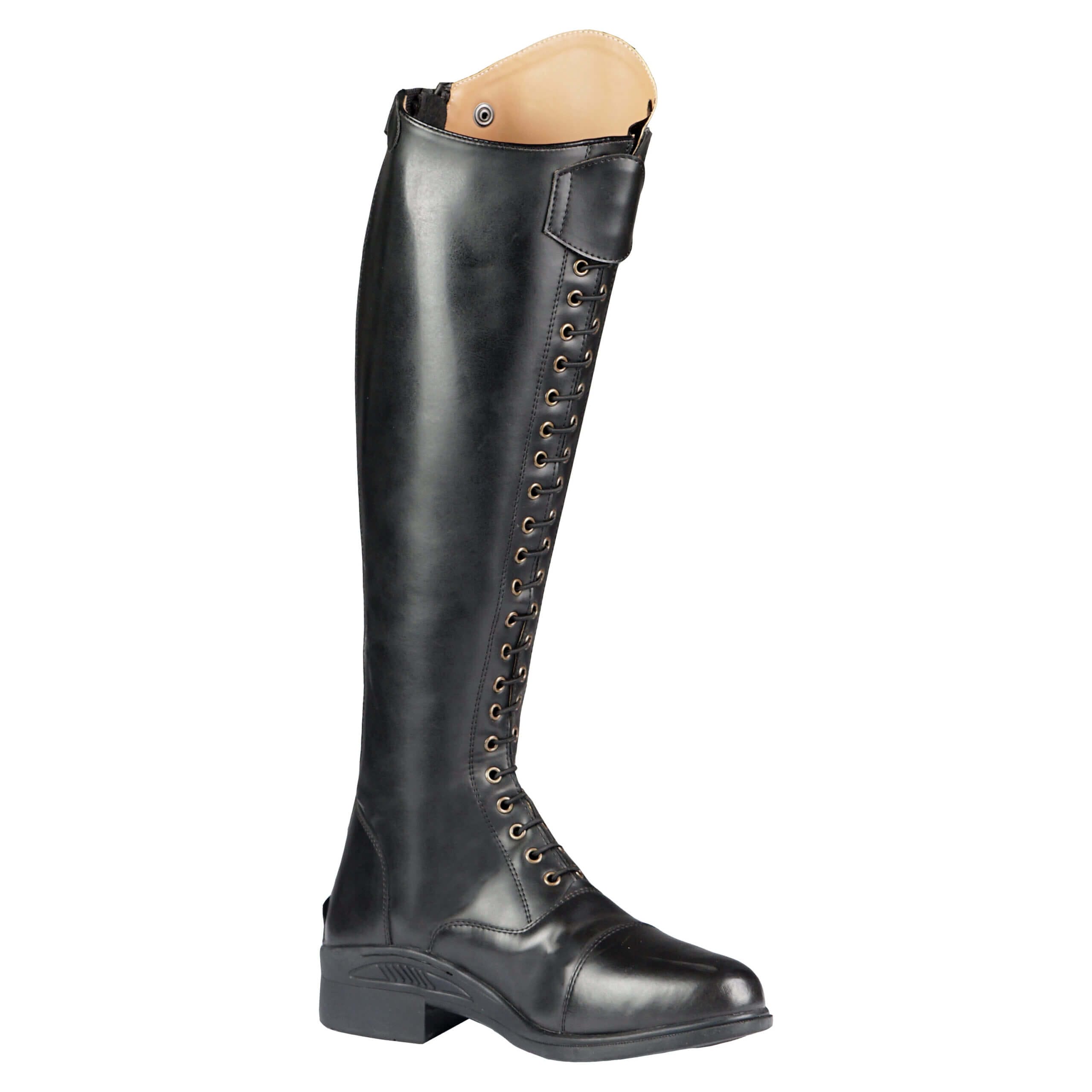 Modieuze rijlaars met veters heeft een zachte stoffen voering. Langs de gehele achterkant is een YKK rits. Deze rijlaars is te verkrijgen in verschillende kuitwijdtes. : Product specificaties: Modieuze rekbare synthetisch lederen rijlaars met veters Zachte stoffen voering YKK rits langs de gehele achterkant Elastiek aan één kant langs de rits Ritssluiting houder aan de bovenkant Verkrijgbaar in verschillende kuitwijdtes