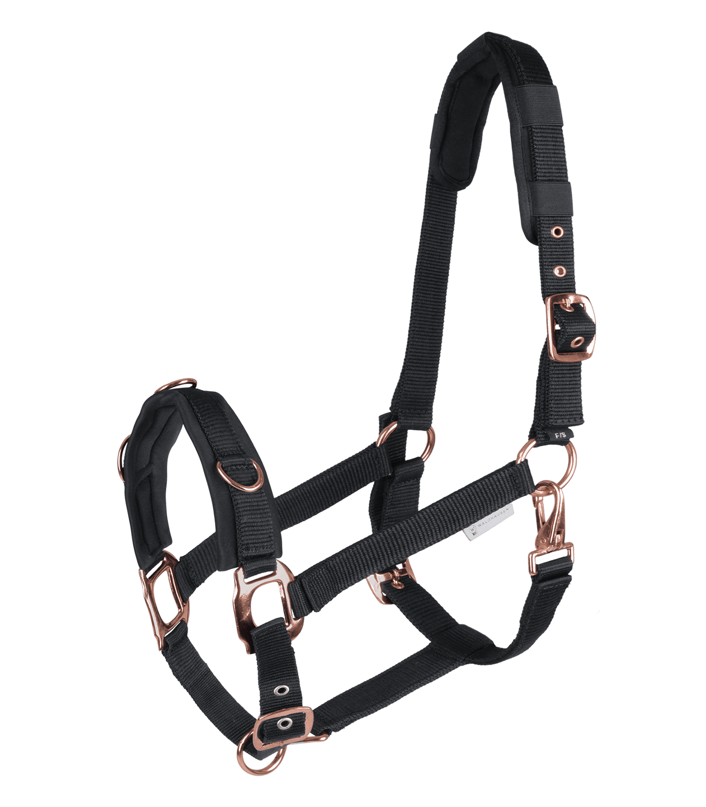 Vervaardigd uit sterk nylon webbing, verstelbaar bij het kopstuk, de kin- en keelriemen. Het kopstuk en de neusriem zijn zacht gevoerd. Uitgevoerd met roségouden sluitingen. Beschikbaar in maten Full, Cob, PON, kleur zwart.