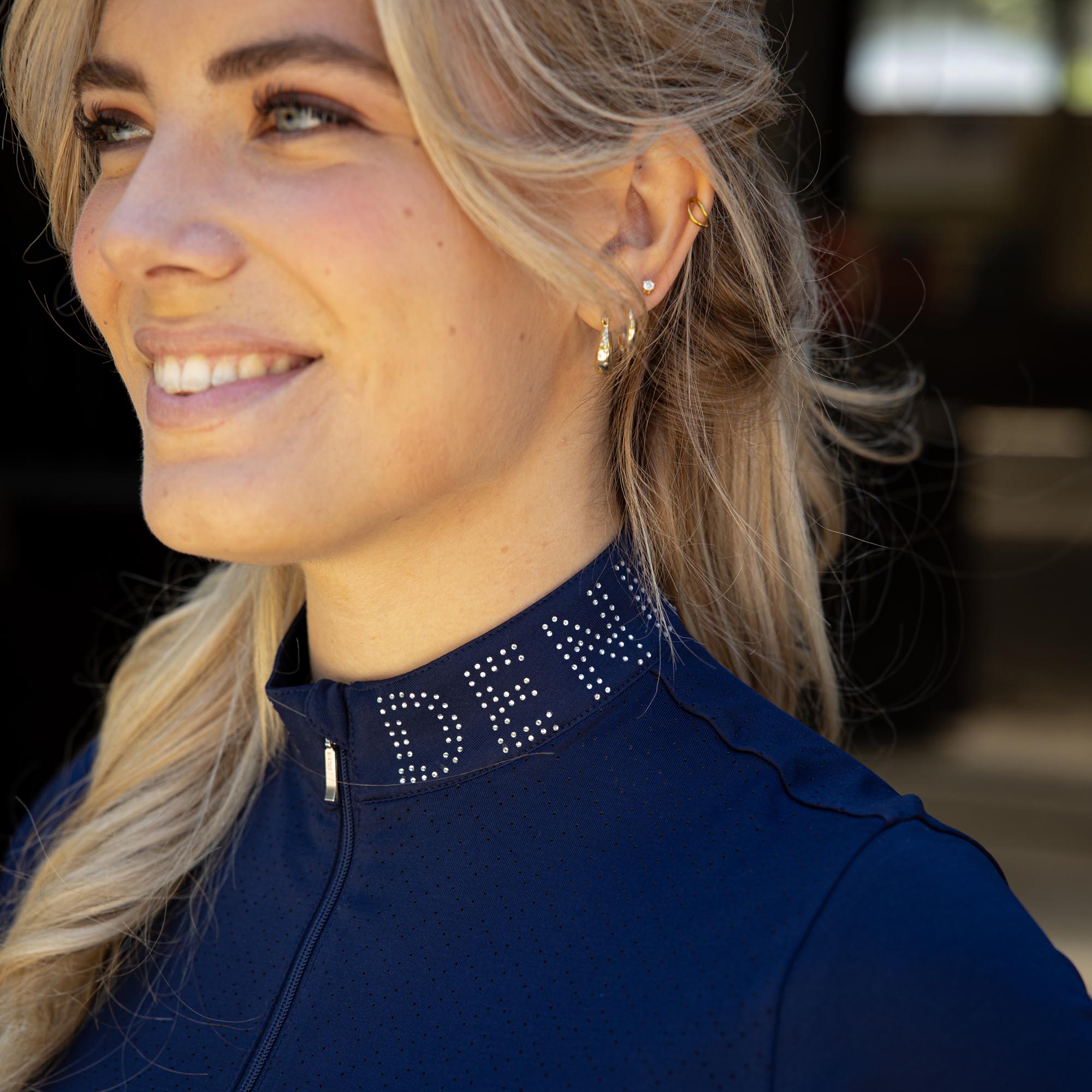Shirt met een opstaande kraag, voorzien van de tekst Denici Cavalli in kristallen, en een korte ritssluiting. De bovenkant van het voor- en achterpand is afgewerkt met een stijlvolle lasercut-details. Materiaal: 92% polyester, 8% elastaan.