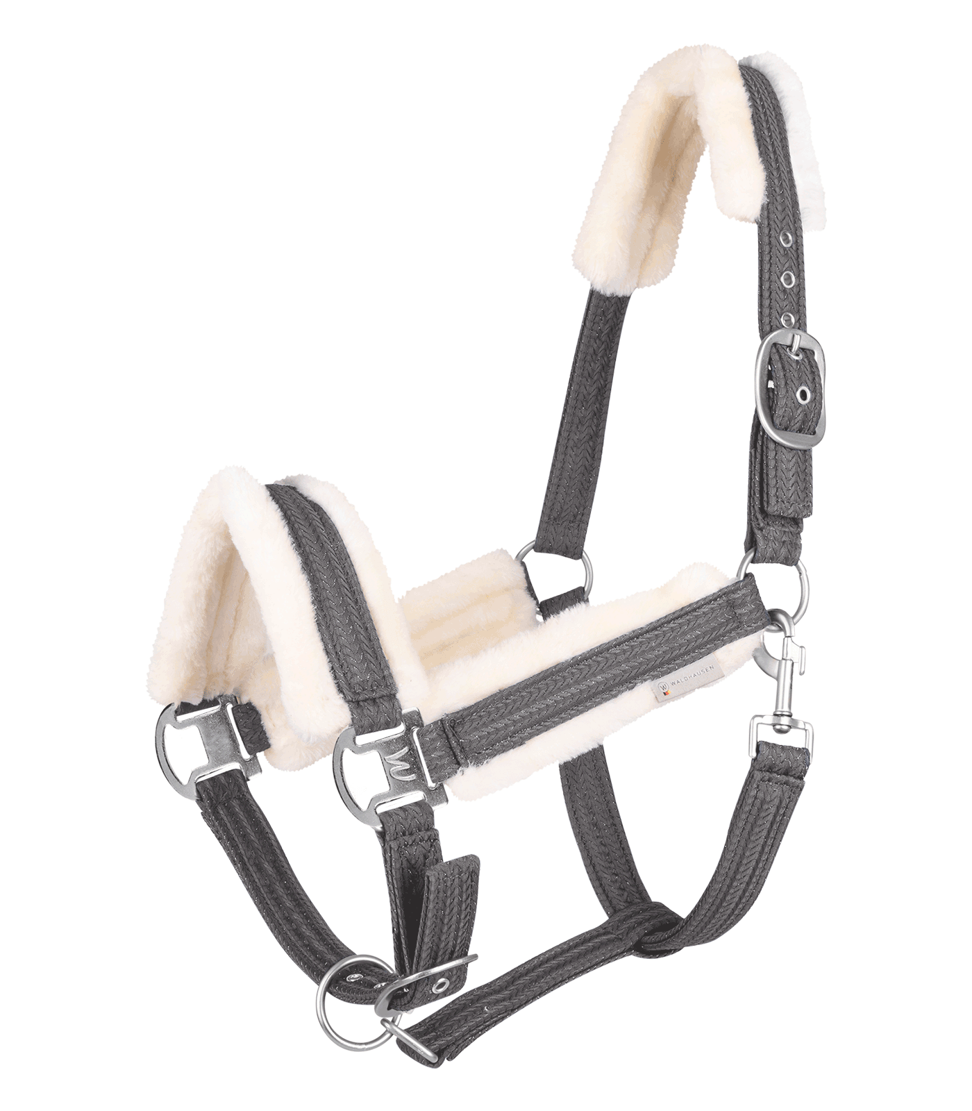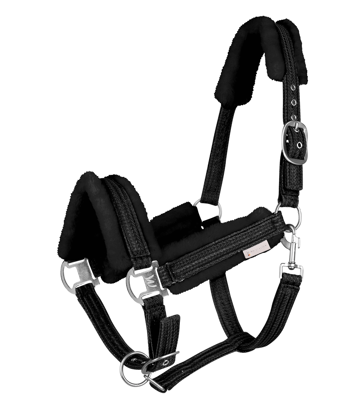 Het Sparkle halster kenmerkt zich door de Waldhausen gesp, verstelbaar bij de kinriem en het kopstuk. Voorzien van zachte synthetische bontvoering op het kopstuk, de neusriem en de bakstukken voor optimaal comfort.