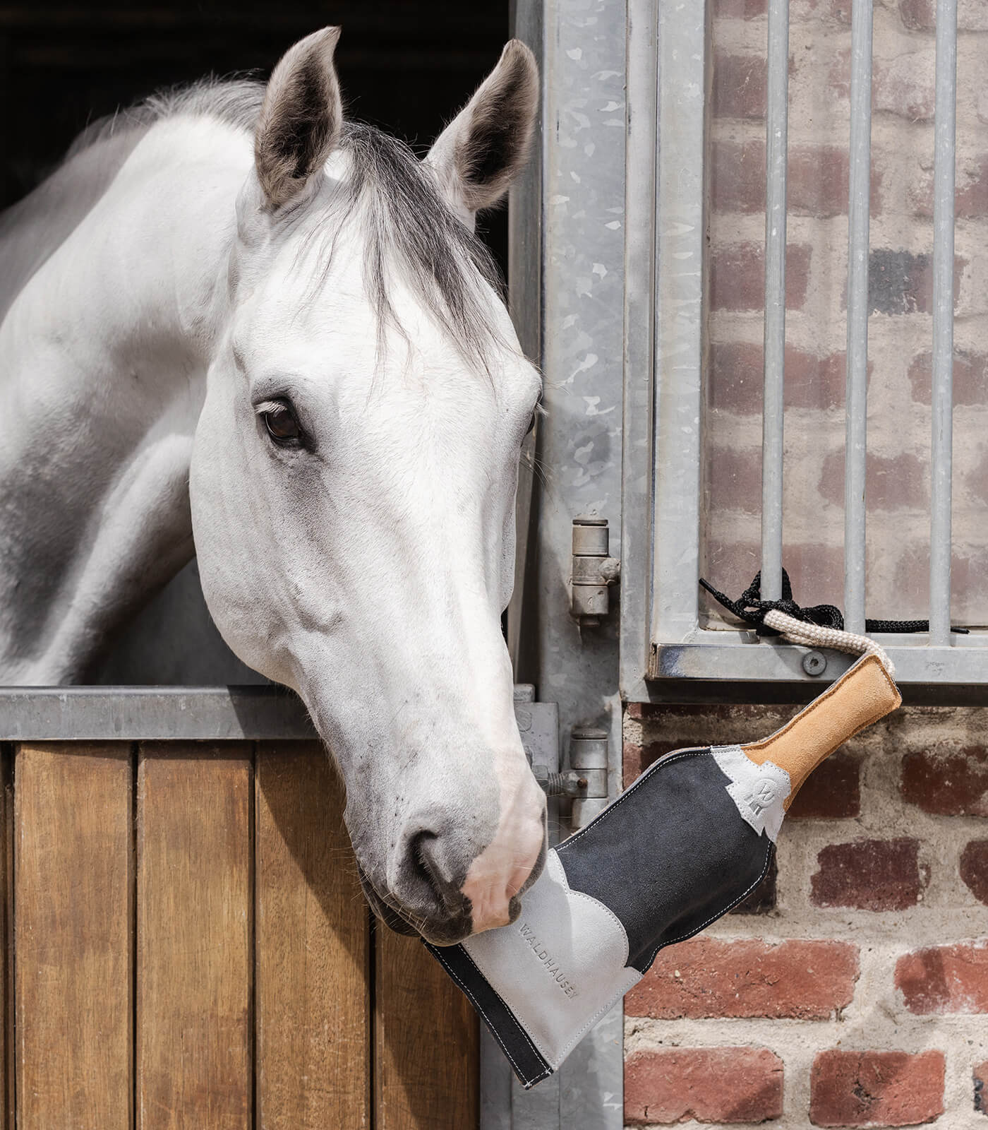 Door in de buik te knijpen komt er een krakend geluid vrij dat paarden fascineert en aanzet tot spelen.