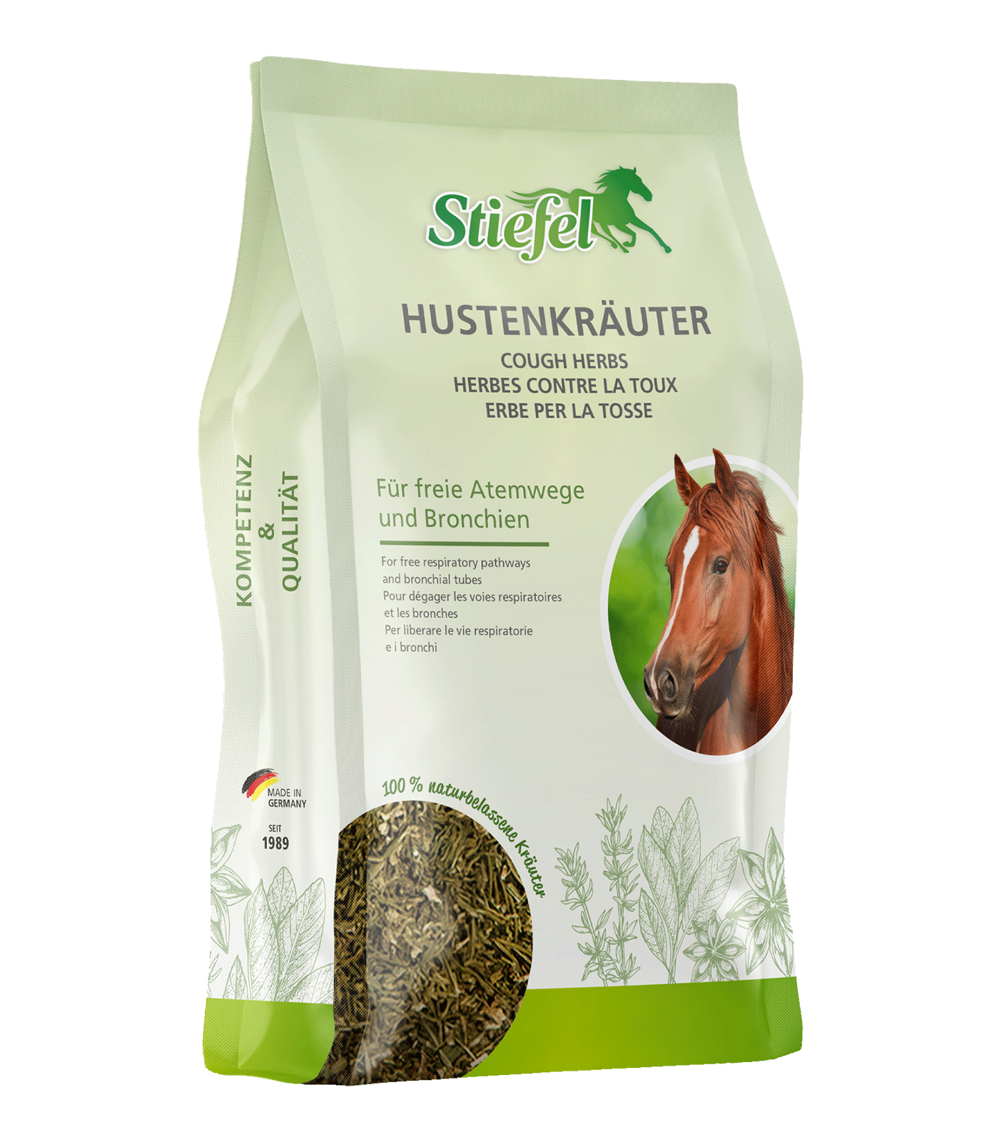Stiefel hoestkruiden, een natuurlijke kruidenmix van 1 kg, ondersteunt de luchtwegen en bronchiën van paarden bij stress door huisvesting en voeding. Geschikt voor langdurig gebruik.