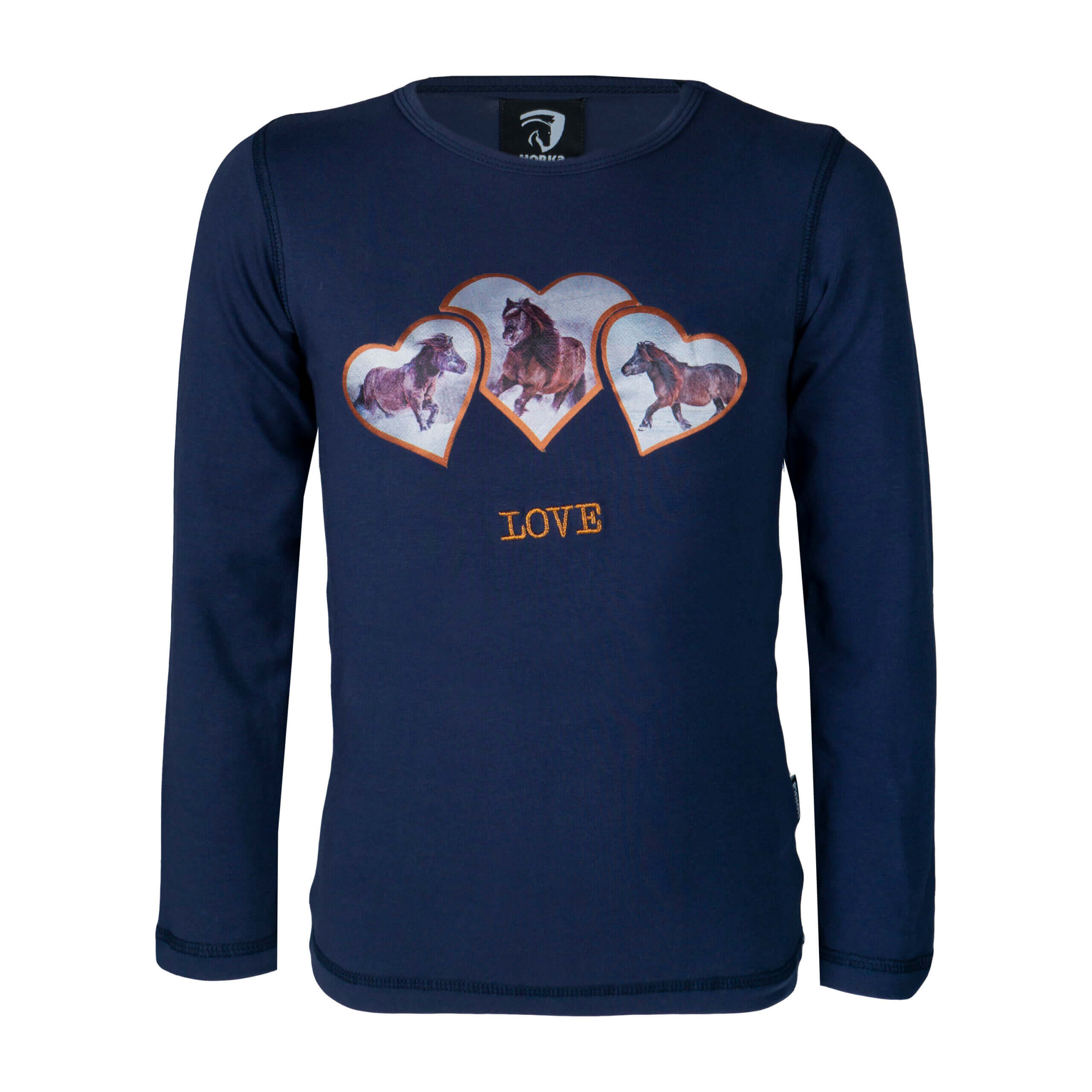 Schattig kindershirt met lange mouwen. Productspecificaties:< Paarden fotoprints in geborduurde hartomtrek Materiaal:< 95% Katoen Single Jersey 5% Lycra 230 gsm :