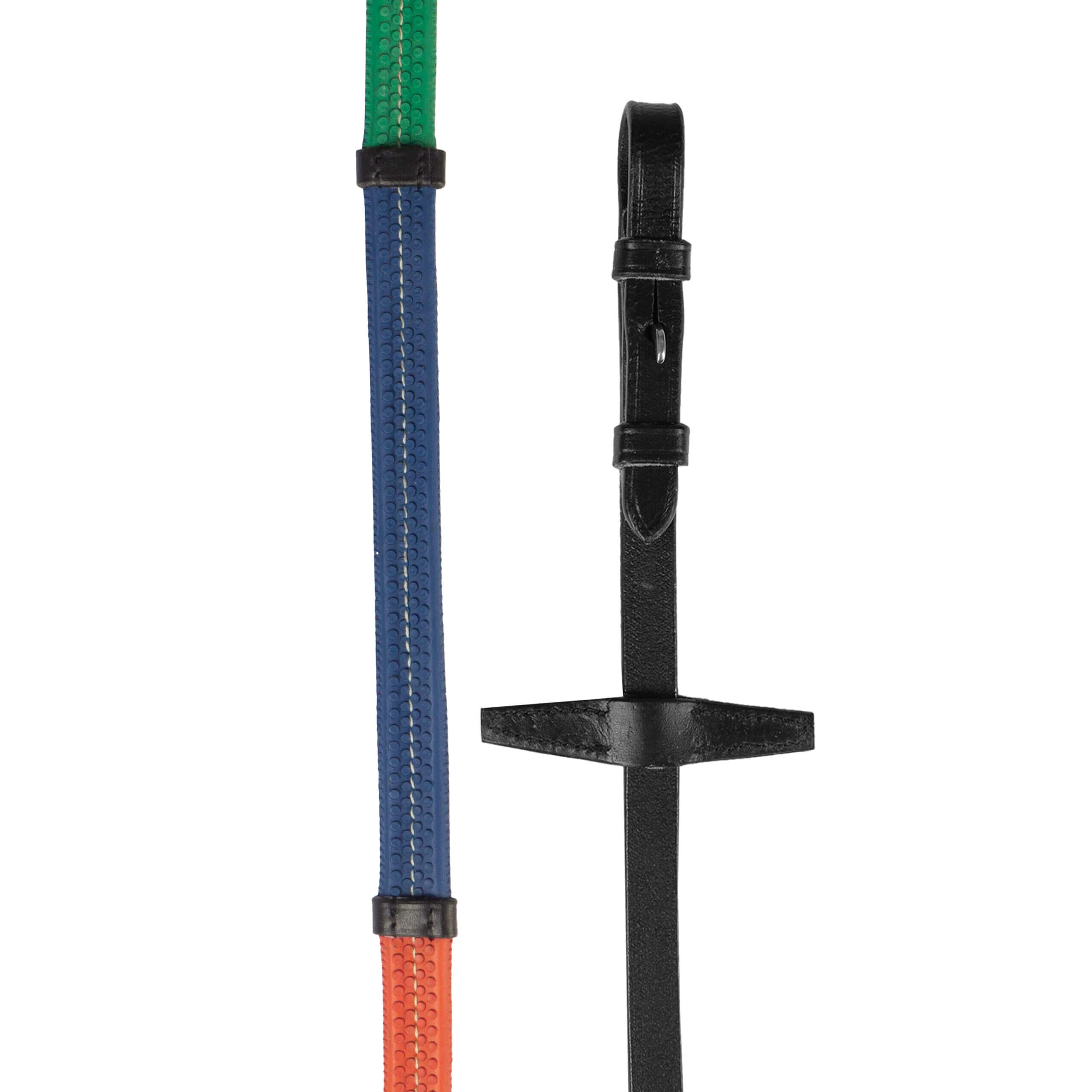 Gekleurde rubberen teugels met 6 stops. Productspecificaties: 17 mm rubber perfect voor kinderen Met 6 stops Afgewerkt met zwart leer Materiaal: Leer rubber en metaal