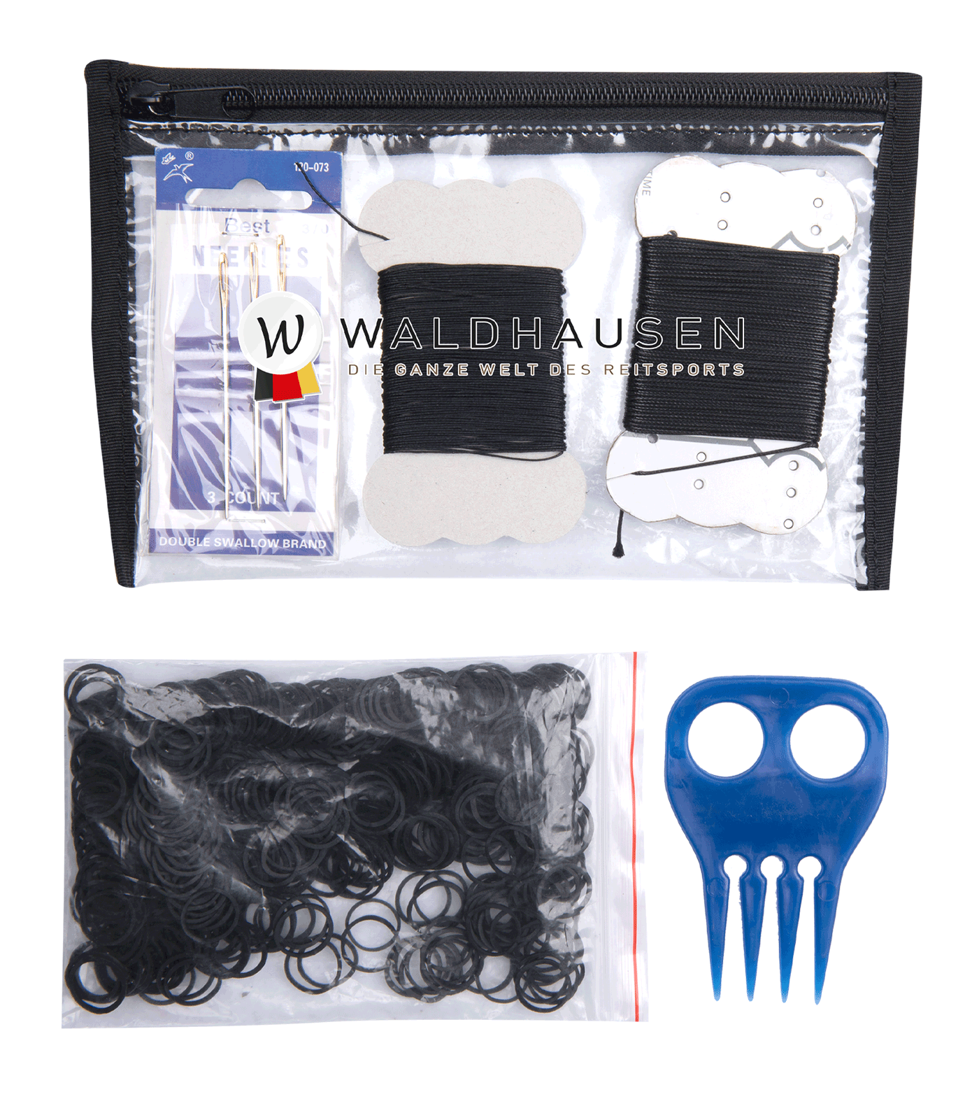 De Waldhausen Vlechtset bevat elastische vlechtbandjes, een duurzame vlechtkam, een naaldset, scherpe schaar en sterk vlechtgaren, verpakt in een stijlvolle tas. Ideaal voor elke wedstrijd.