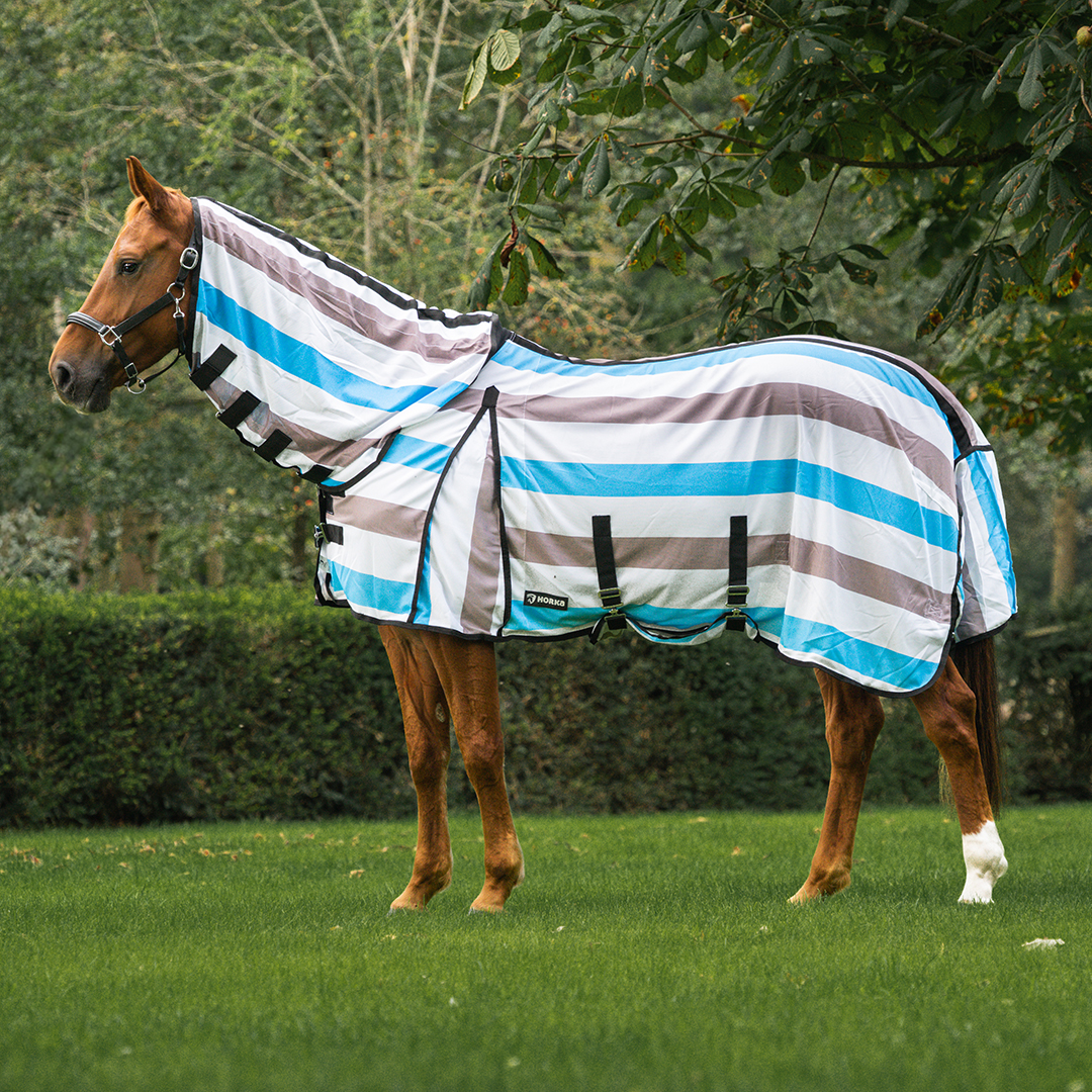 Sterke ballistic mesh vliegendeken met vaste hals uitgevoerd met gestreept patroon. Productspecificaties: Met vaste hals verbindingsdeel uitgevoerd in zacht nylon Dubbele verstelbare snel sluiting op de borst Twee buiksingels met rubber stops Met staartflap Afneembare en verstelbare bilkoorden Materiaal: : 100% polyester ballistic mesh 320 gsm