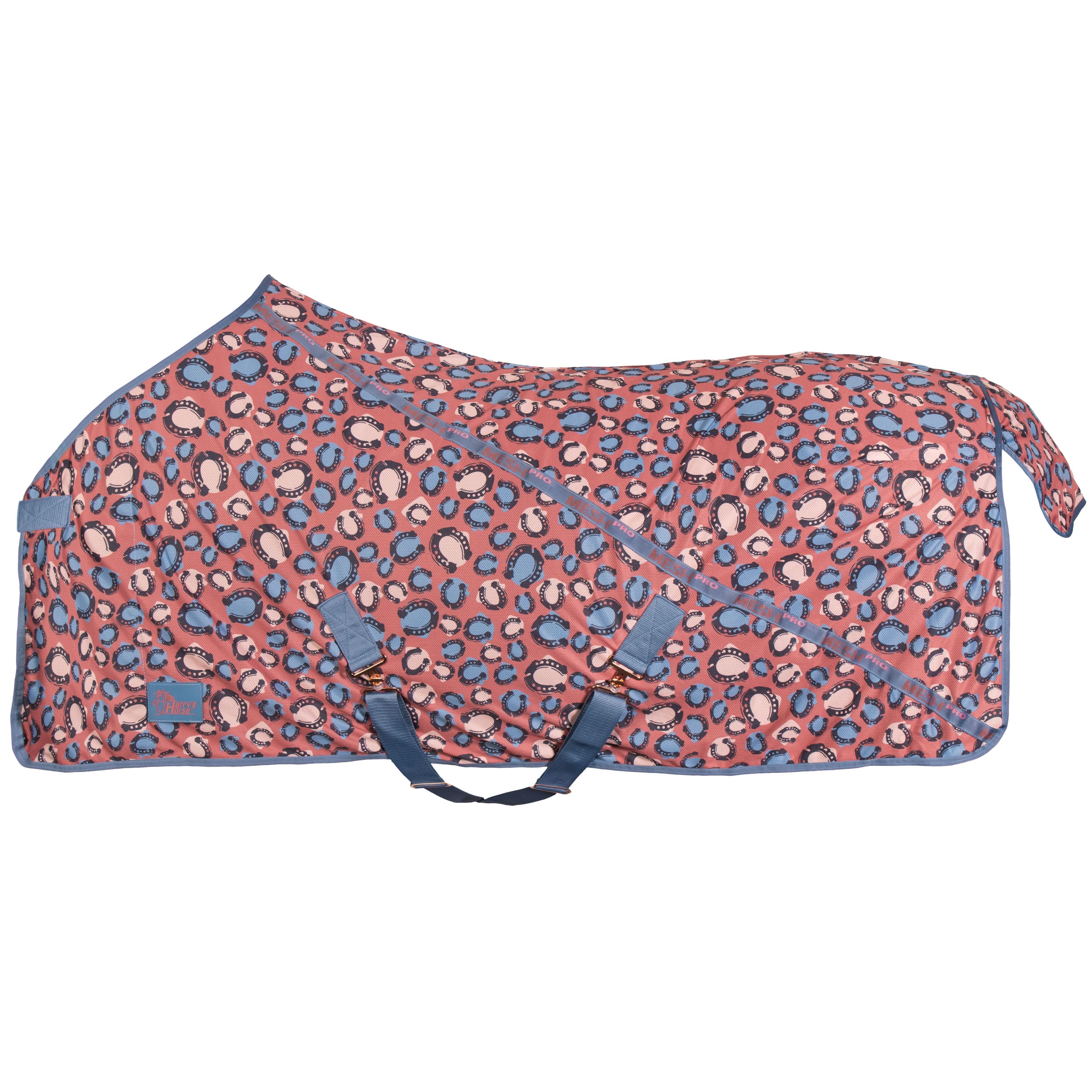 Leuke mesh deken met hoefijzer allover print te gebruiken als vliegendeken of cooler deken, enkele klittenband voorsluiting, twee kruissingels, staartlus, voorkant nylon gevoerd om kale plekken te voorkomen.