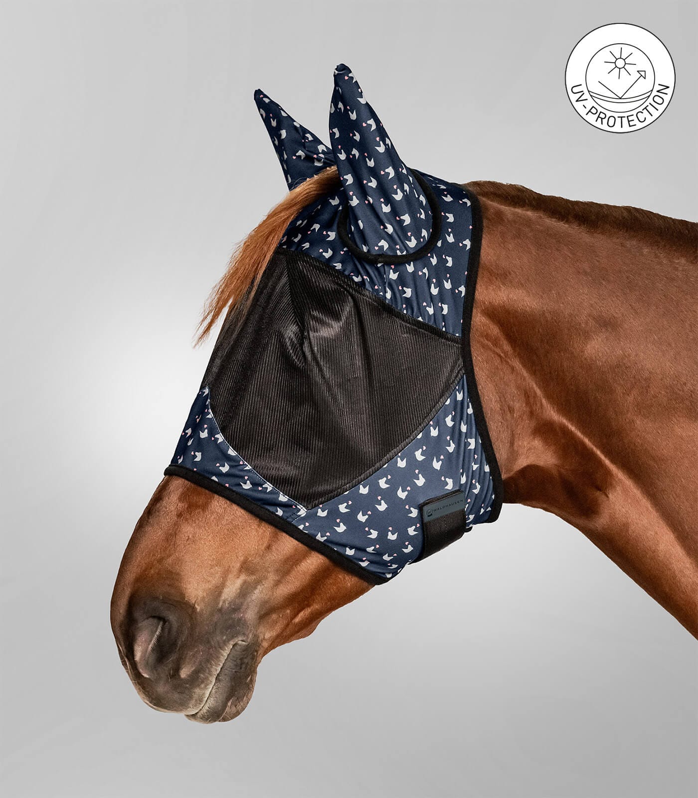 Het Lucky Fly vliegenmasker is vervaardigd uit elastische stof met aanpasbare klittenbandsluiting voor een optimale pasvorm. Beschikbaar in maten Full, SH, Cob, MSH, PON, uitgevoerd in nachtblauw met een charmante all-over print en zachte neusbandvoering.