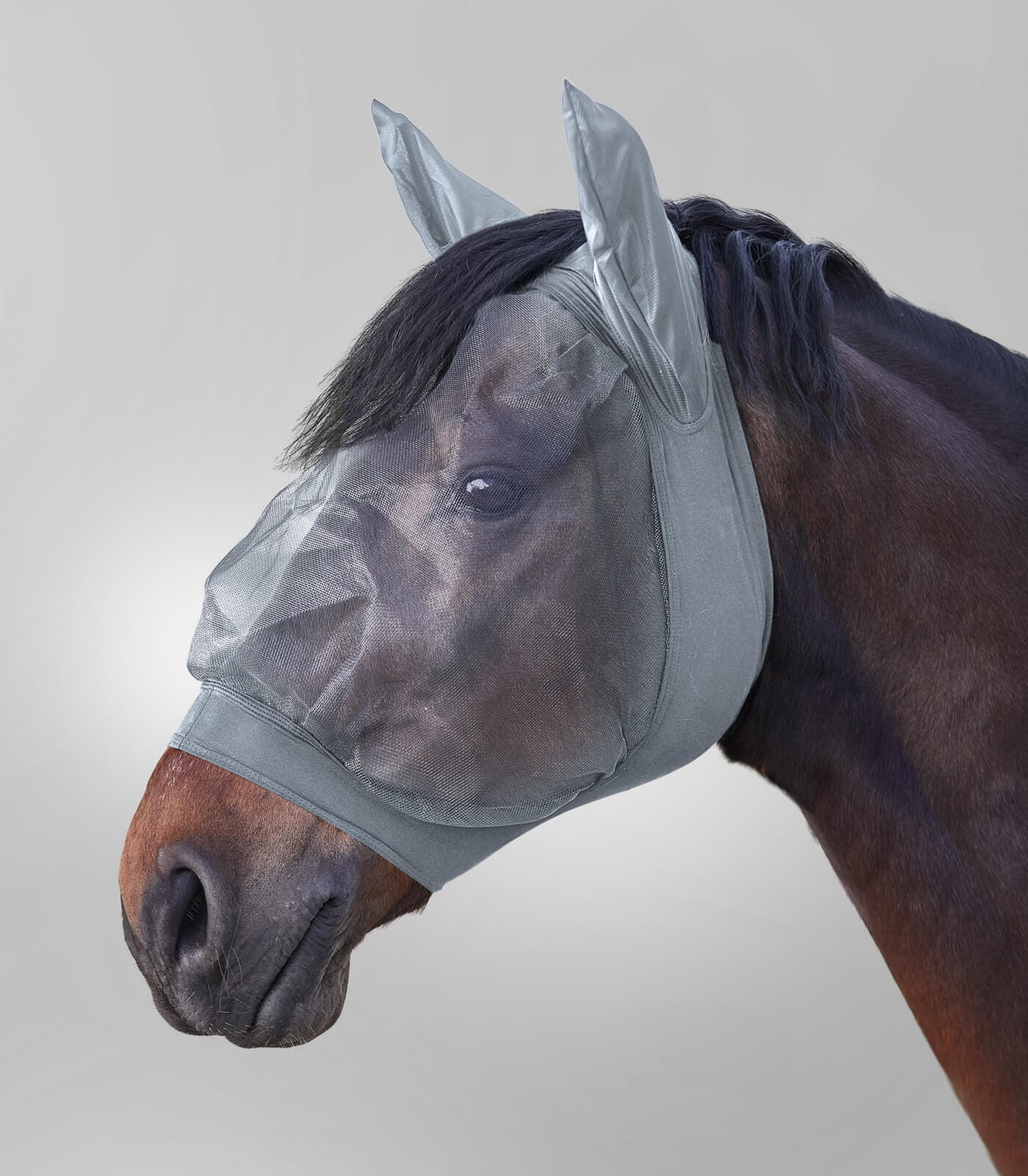 Het vliegenmasker is vervaardigd uit glad, elastisch materiaal voor een nauwsluitende pasvorm. Beschikbaar in maten Full, SH, Cob, PON, XFull en in kleuren zwart en zilvergrijs. Uitgerust met duurzame riemen en gespen voor optimale aanpassing.