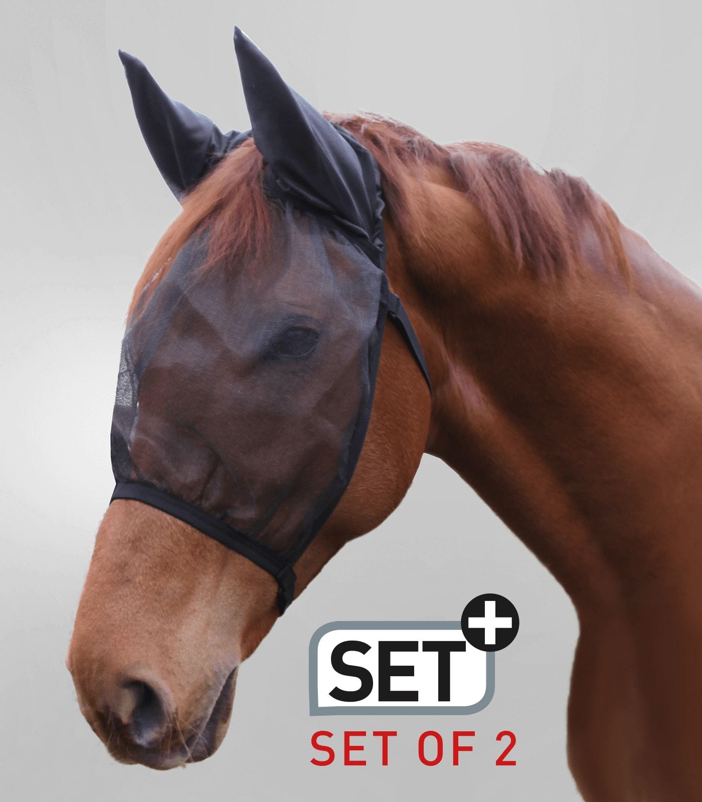 Set van 2 vliegenmaskers met oorbescherming, ideaal voor paardrijden. Fijnmazig net beschermt ogen en oren tegen insecten. Aanpasbare keel- en neusband voor perfecte pasvorm. Ruimte voor de voorpluk.