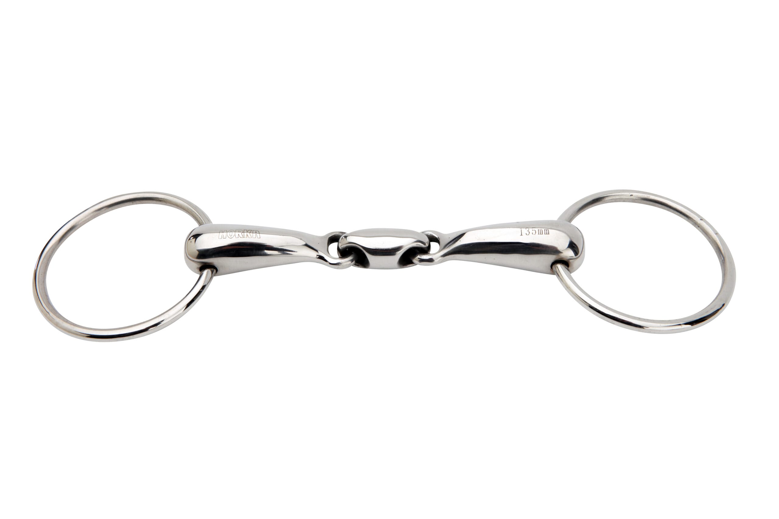 Dubbel gebroken watertrens 19 mm met elips vormige schakel. Productspecificaties: Hol Dikte: 19 mm Ring: 55 mm (105 115 cm) Ring: 65 mm (125 135 145 155 cm) Roestvrij staal