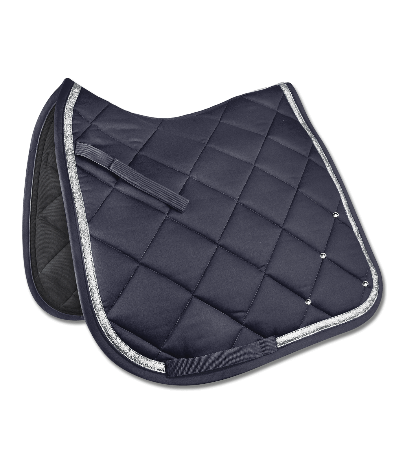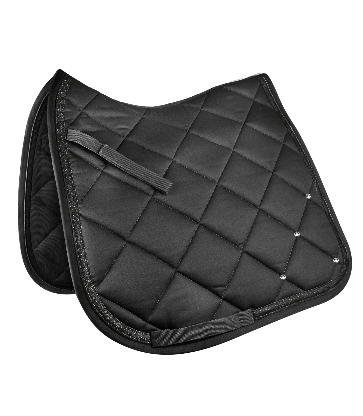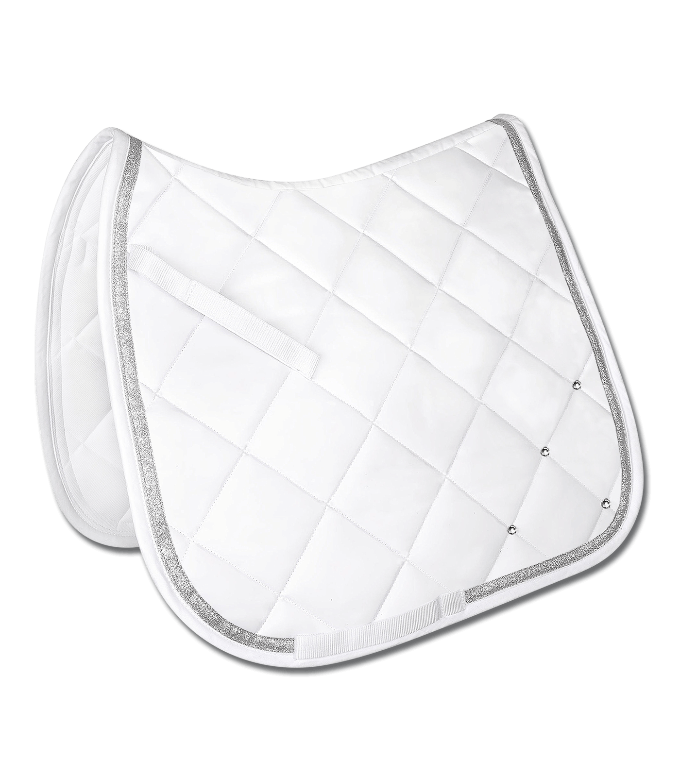 Dit wedstrijd zadeldek met glitterrand en strassteentjes trekt gegarandeerd de aandacht. De ademende onderzijde en optimale drukverdeling door 8mm schuim en 250 g/m² vulling bieden uw paard comfort en stijl tijdens elke prestatie.