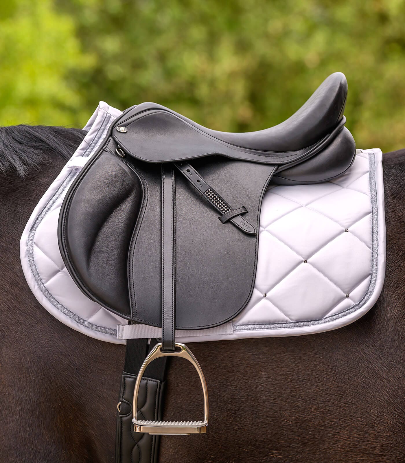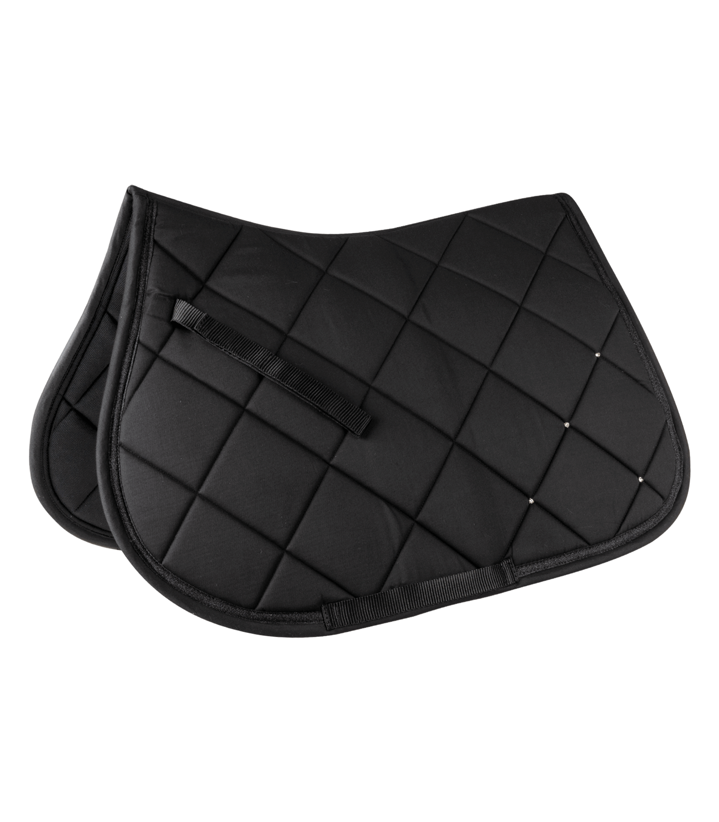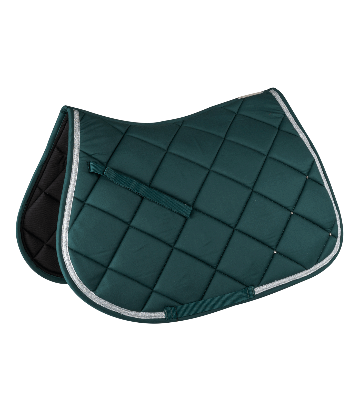 Dit wedstrijd zadeldek met glitterrand en strassteentjes trekt gegarandeerd de aandacht. De ademende onderzijde en optimale drukverdeling door 8mm schuim en 250 g/m² vulling bieden uw paard comfort en stijl tijdens elke prestatie.