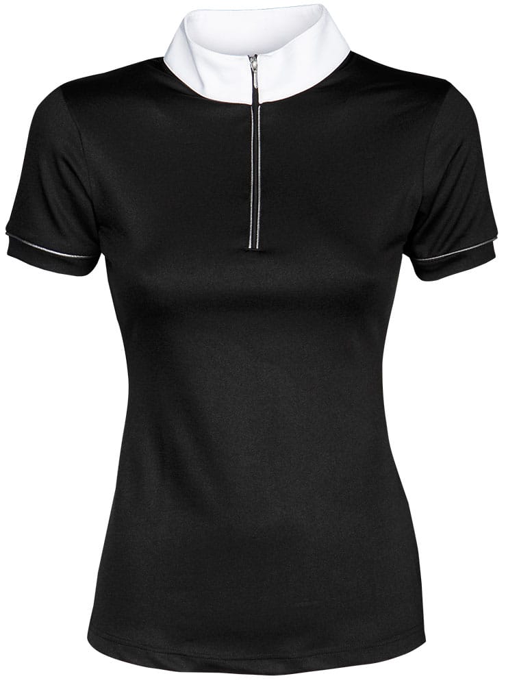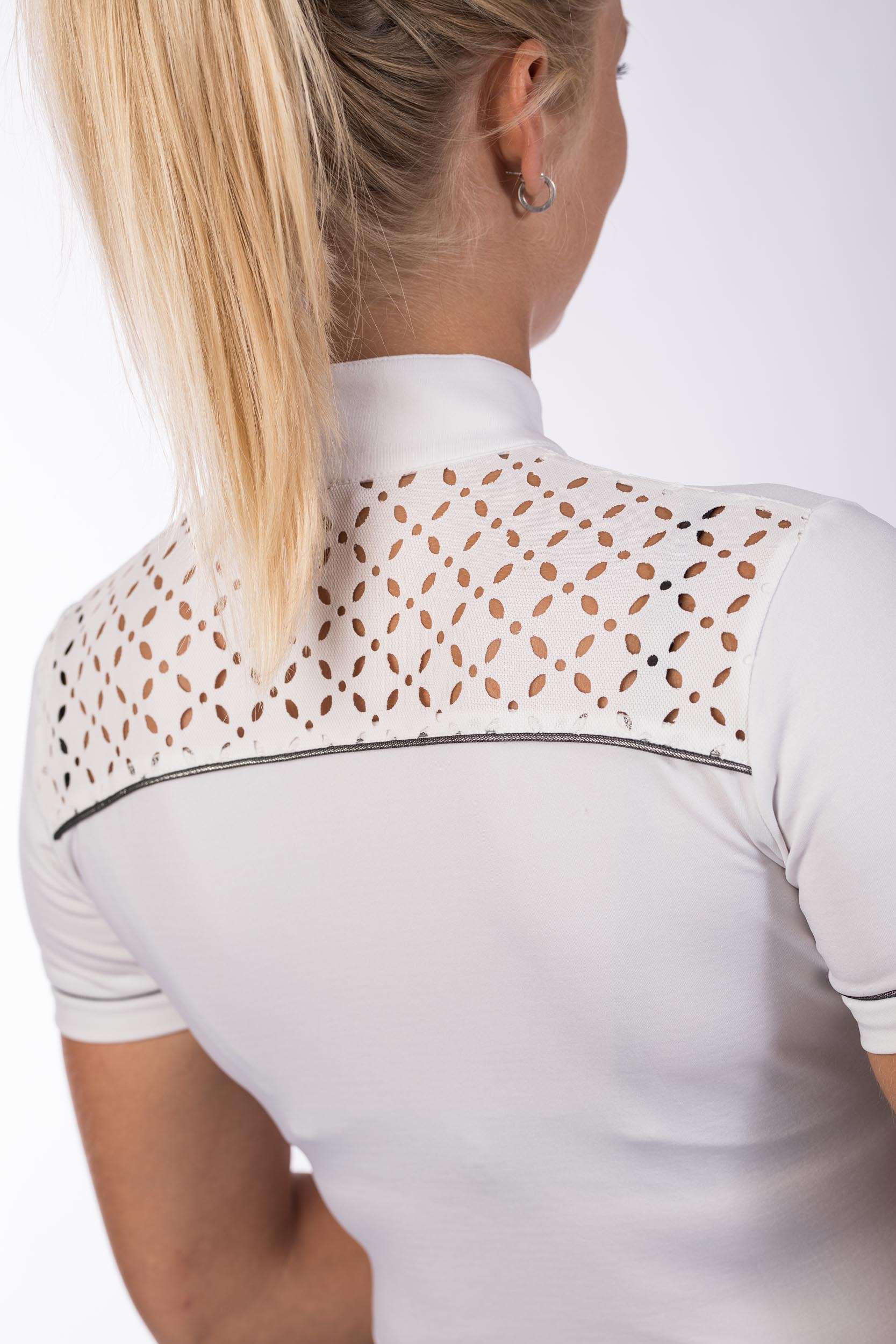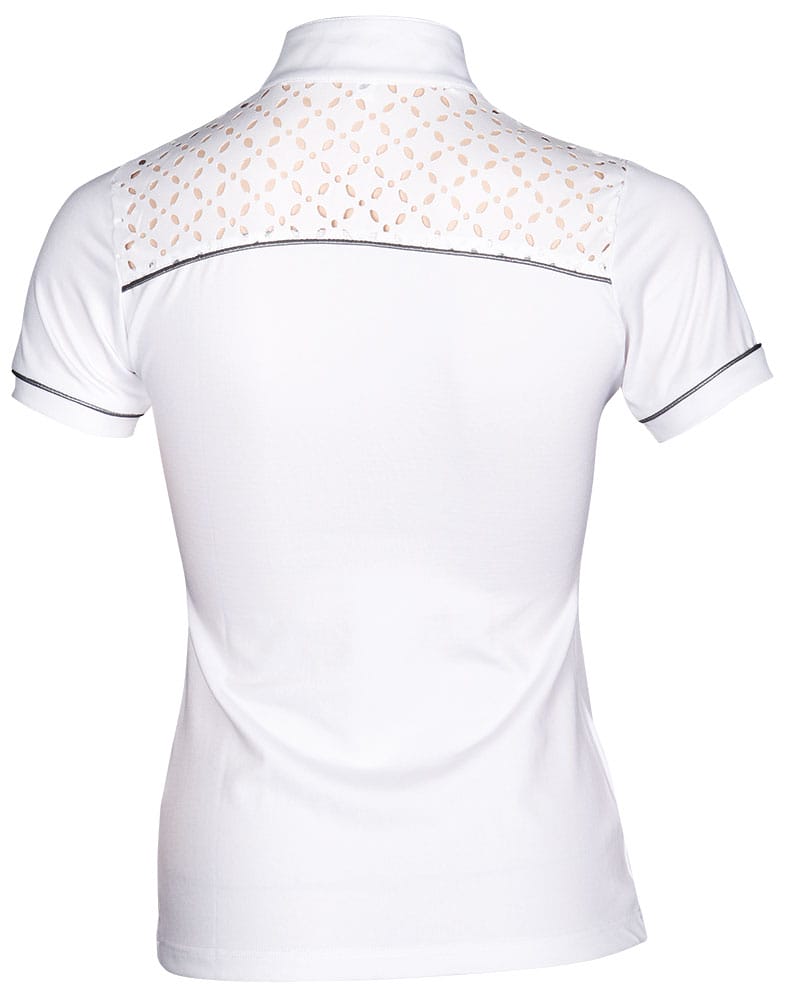 Wedstrijdshirt met korte mouw, opstaande witte kraag met korte ritssluiting met zilverkleurige bies, zilverkleurige bies op de mouw en achterzijde, bovenkant achterzijde is gestanst
