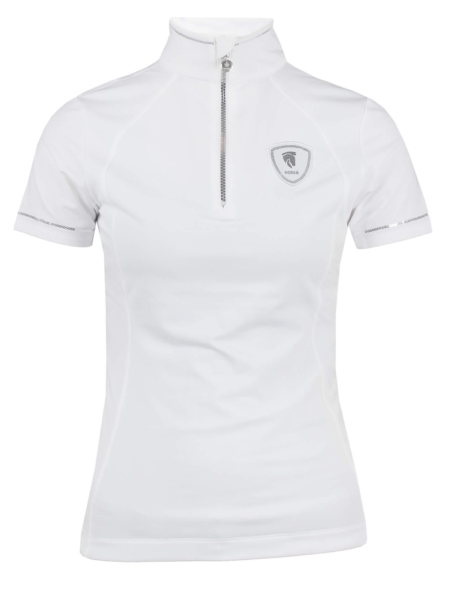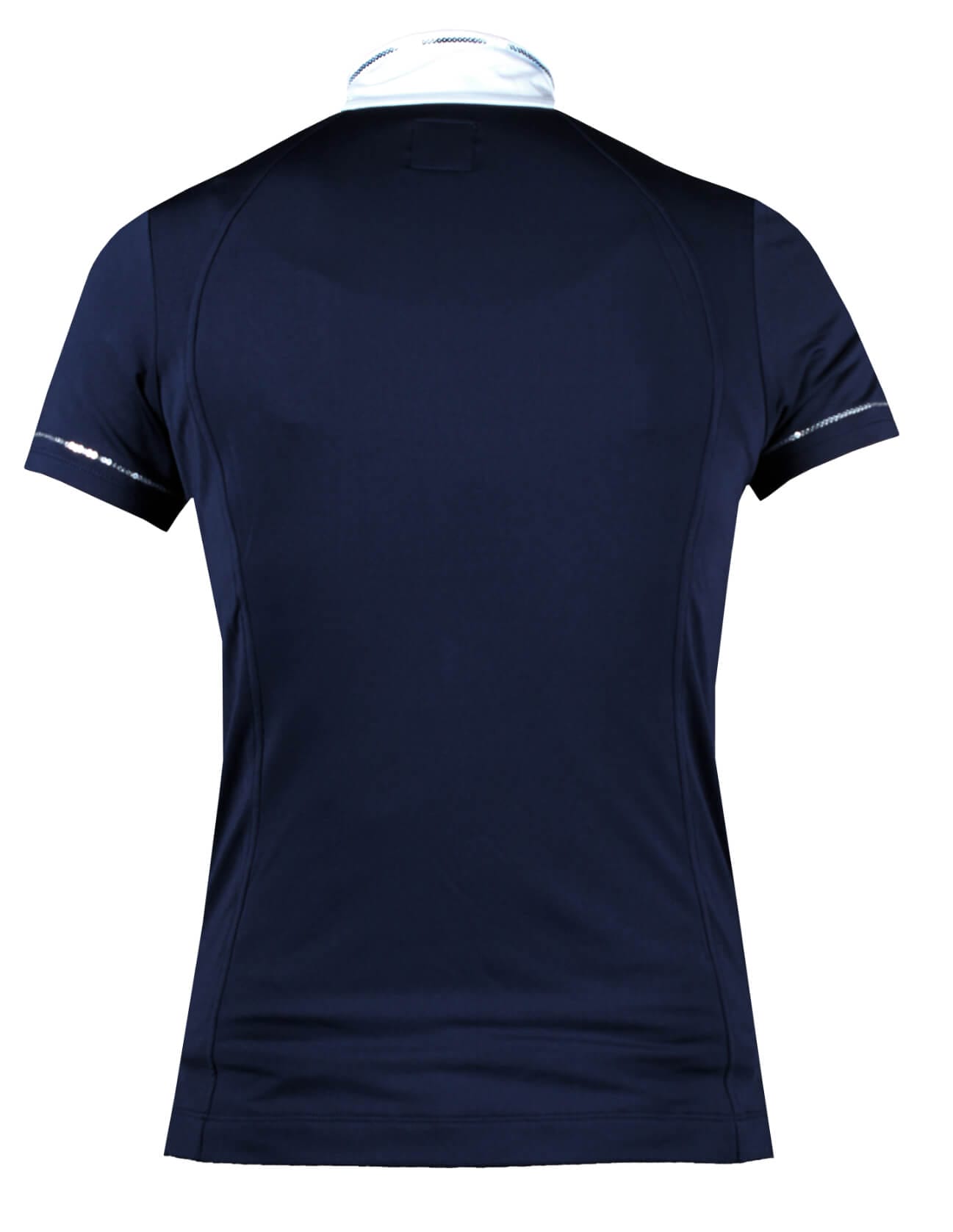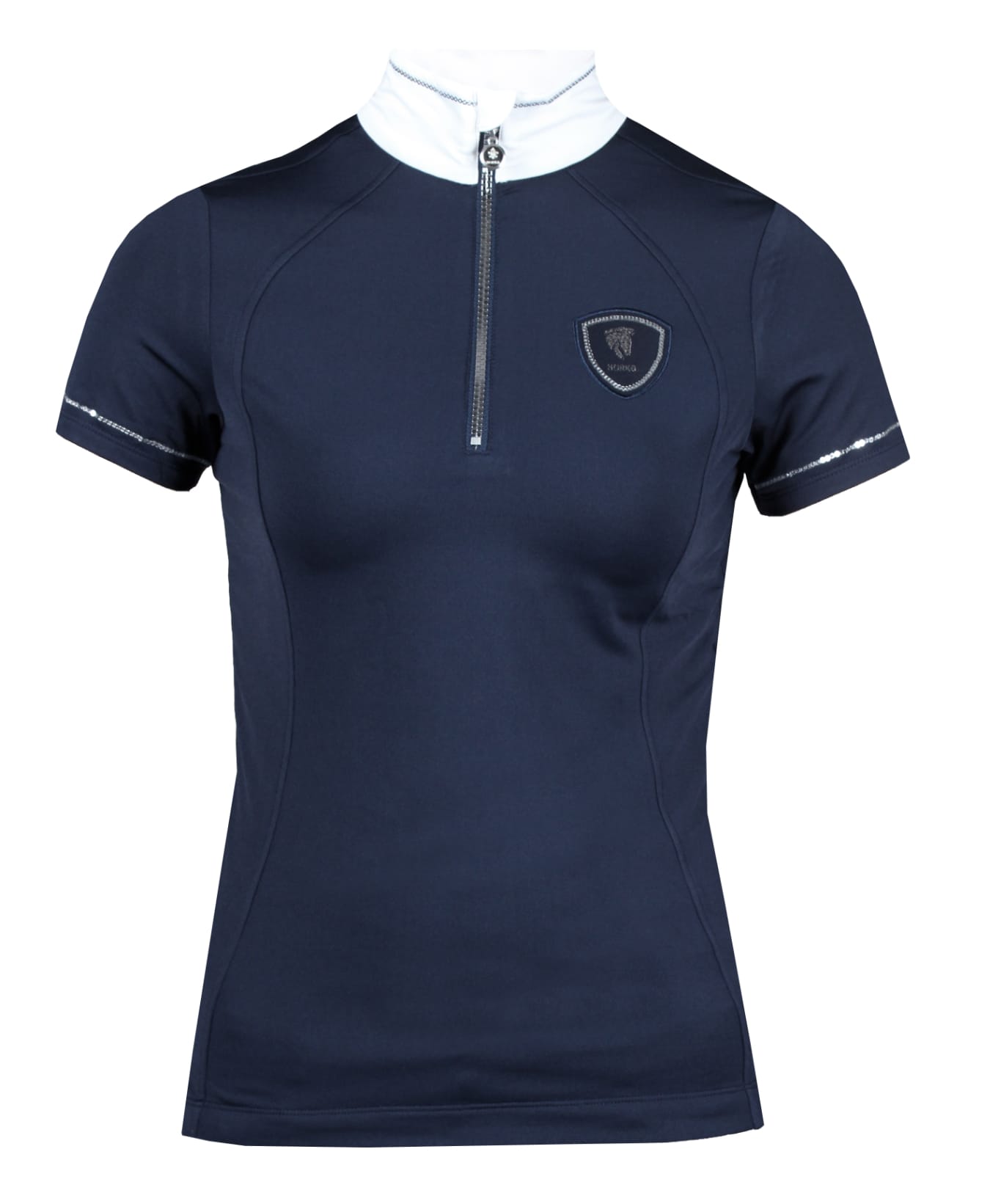 Dames wedstrijdshirt met korte mouwen. Het shirt is vormgegeven met zilveren pailletten onderaan de mouwen en kraag :Productspecificaties: Gemaakt van lichtgewicht ademend en sneldrogend materiaal Behandeld met Polygiene om transpiratiegeur tegen te gaan Zilveren pailletten onderaan de mouwen en kraag Badge met pailletten YKK rits aan de voorkant :Materiaal: 90% polyester 10% elastaan