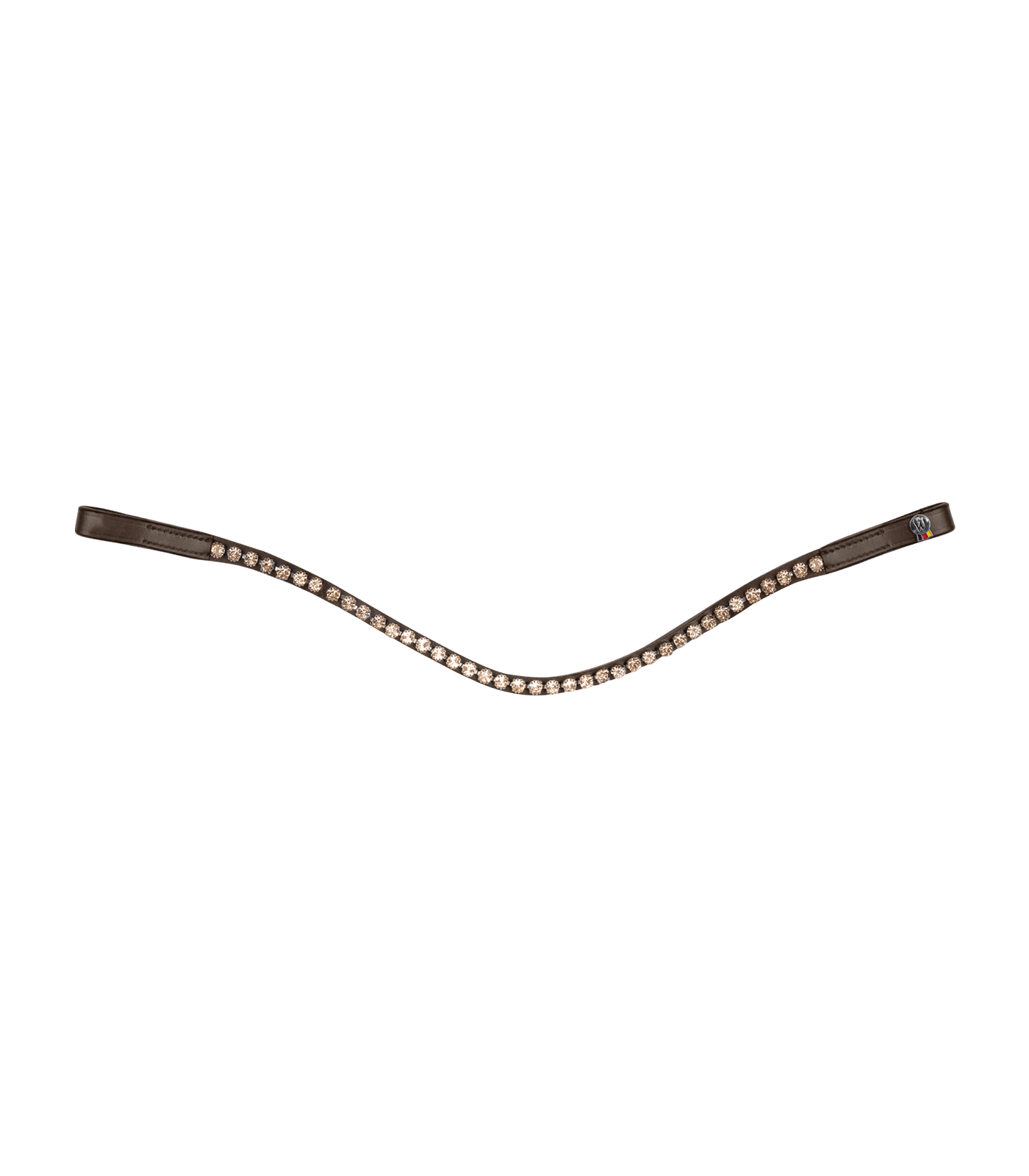De X line frontriem glam, uitgevoerd in bruin, verfraait elk hoofdstel met zijn sprankelende strass-steentjes. Deze smalle, gebogen frontriem combineert elegantie met comfort voor uw paard tijdens elke rit.
