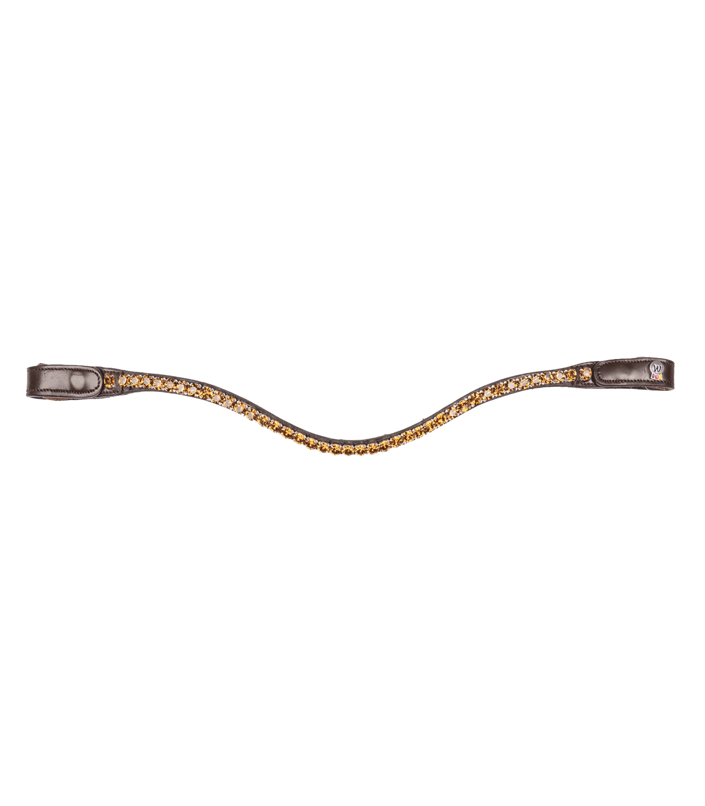 De X line shine frontriem in bruin accentueert met grote sprankelende stenen. Eenvoudig te bevestigen en wisselen door de praktische drukknoop en klittenbandsluiting, perfect voor elke hoofdstel.
